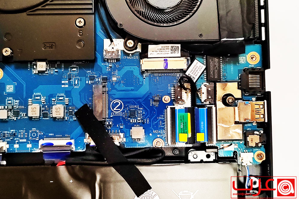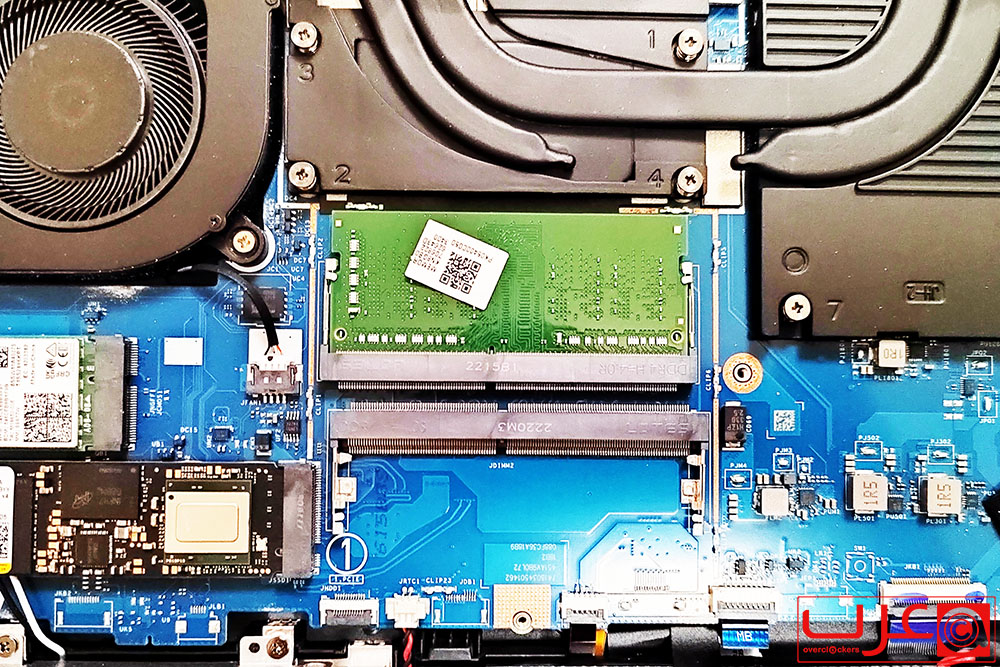 بعد إزالة اللوحة الخلفية، سترى المكونات الداخلية للكمبيوتر المحمول. حدد ما يلي: