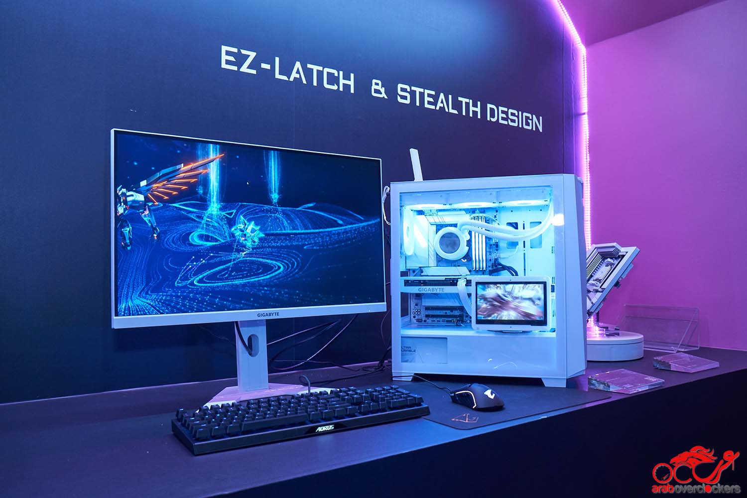 بجانب الشاشات، كانت هناك منطقة عرض اللوحات الأم، حيث تم عرض لوحة B650E Aorus Stealth Ice، والتي وصفها ممثلو Gigabyte بأنها أول لوحة أم بيضاء في العالم تحتوي على موصلات في الخلف. تتطلب هذه اللوحة معالجات Ryzen 9000 بالإضافة إلى سلسلة 7000 و8000. التصميم أنيق جدًا ويحتوي على العديد من وسائل الاتصال في الخلف.