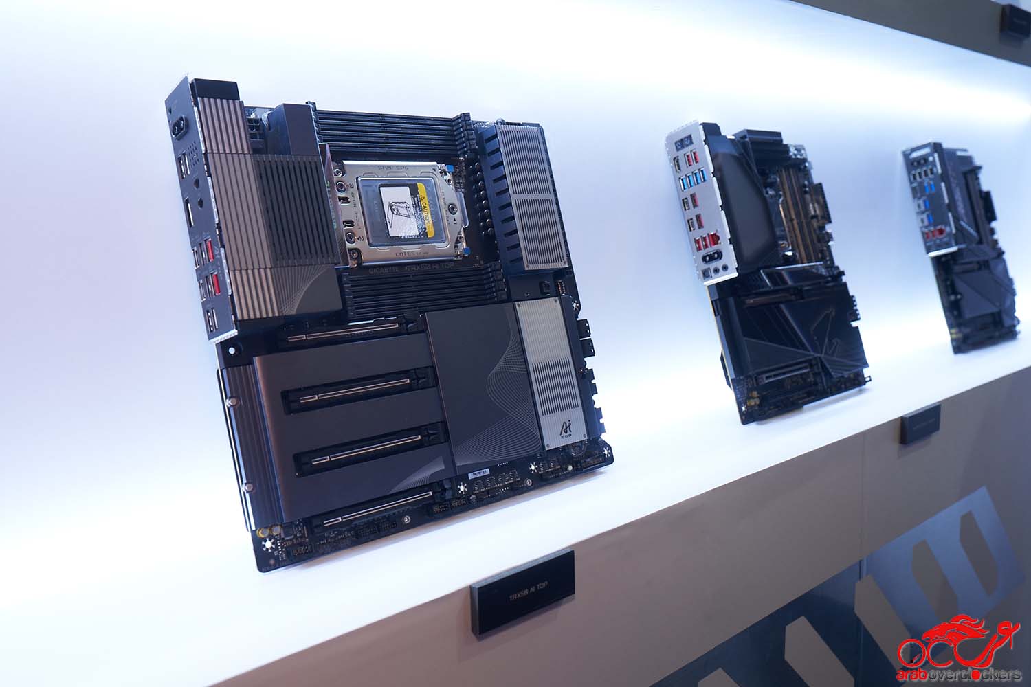 إلى جانب منتجات AMD، عرضت Gigabyte أيضًا منتجات “الجيل التالي من Intel”، لكن لم تكن هناك معلومات كثيرة حول المواصفات الدقيقة. من المتوقع أن تحمل هذه اللوحات في النهاية علامة Ai TOP، حتى لو لم تكن ميزاتها واضحة (بخلاف التبريد الأفضل، القدرة على التعامل مع الطاقة العالية، والمساحة لتركيب ما يصل إلى أربع بطاقات رسومات Ai TOP).