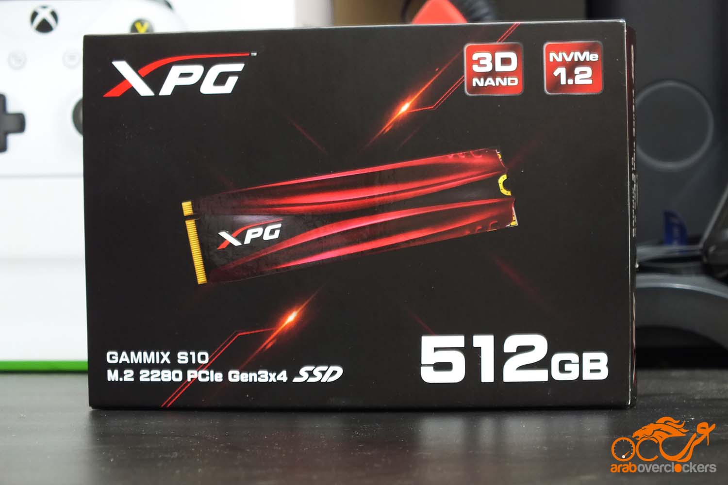 يأتي قرص ADATA GAMMIX S10 في علبة صغيرة مناسبة لحجمه، تظهر المشتت باللون الاحمر والاسود وانحنائاته على واجهة العبوة، مع ظهور سعة القرص بشكل واضح في الركن السفلي، اما الركن العلوي فيظهر نوع ذواكر ال NAND بالاضافة الى موديل تقنية NVMe.