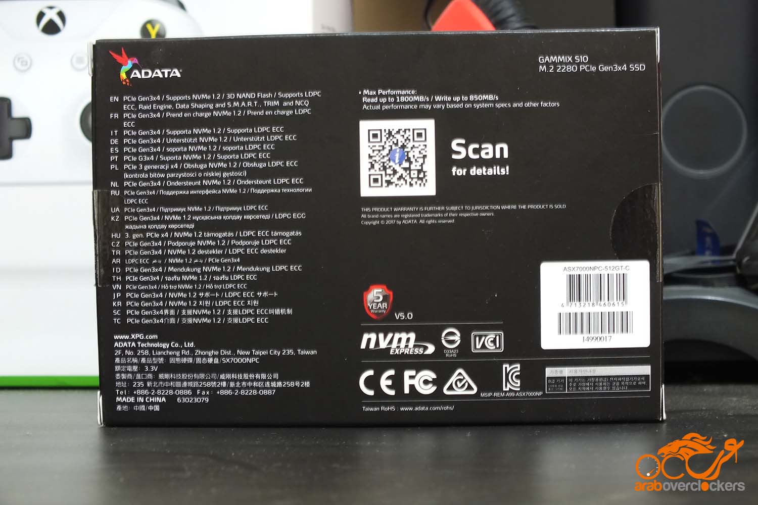 الجعة الخلفية من العبوة تحتوي على لبعض التقنيات المستخدمة في القرص وخصوصا تقنية NVMe بالاضافة الى ذكر اعلى سرعات ممكن ان يصل اليها القرص وهي 1800 ميجابايت/ثانية للقراءة و 850 ميجابايت/ثانية للكتابة، وسنعلم لاحقا من خلال الاختبارات مدى دقة هذه الارقام.