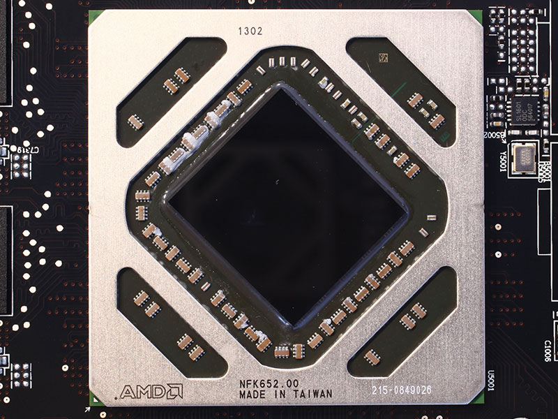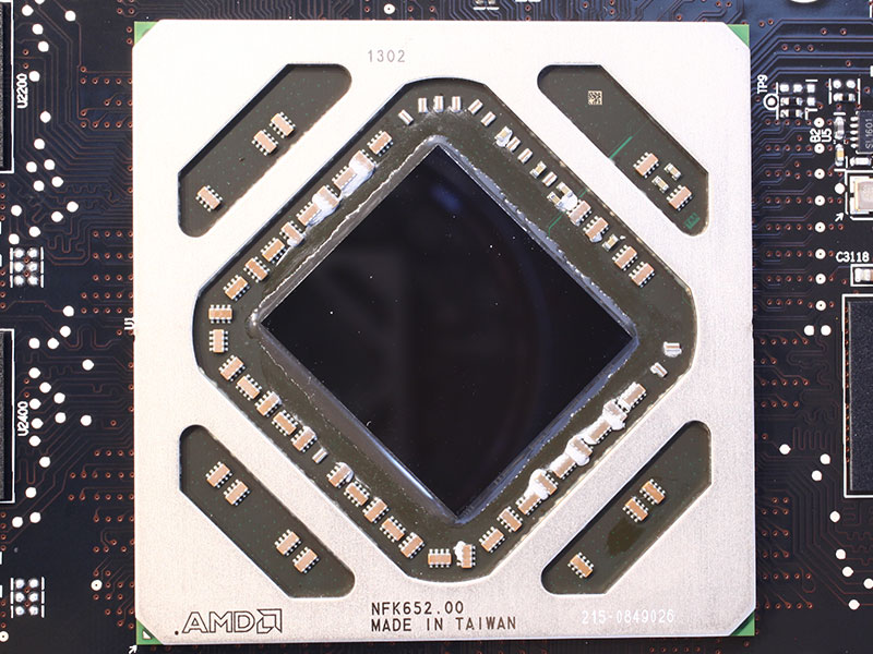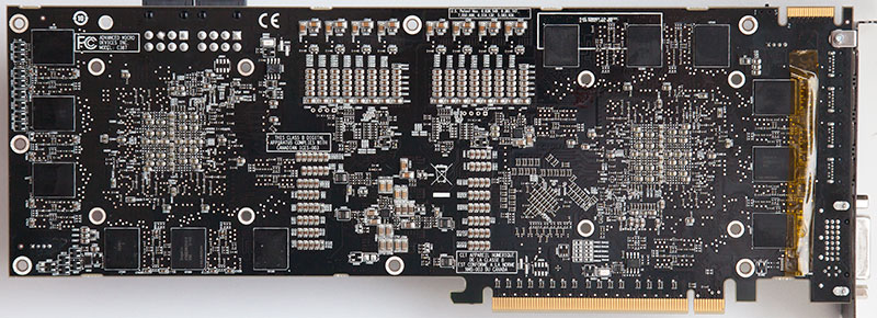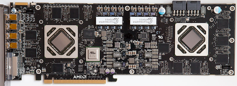 بالنسبة للوحة الرئيسية الحاملة للمعالجات الرسومية للبطاقة “PCB” فأن شركة AMD أبدعت فى تصميم اللوحة الرئيسية القياسية للبطاقة وكما نرى وجود المعالجان الرسوميان والذواكر وأستخدام دوائر الطاقة عالية الكفاءة وبالطبع شعار AMD مطبوع أسفل اللوحة.