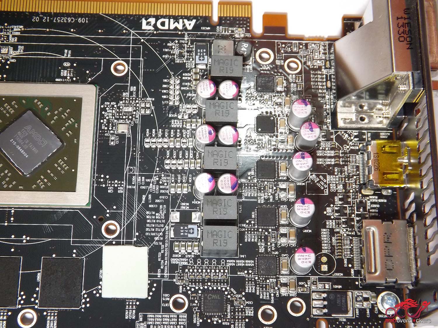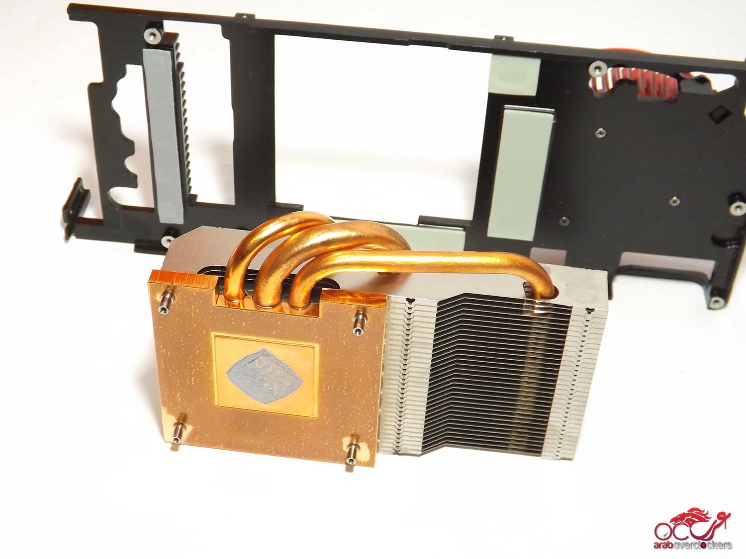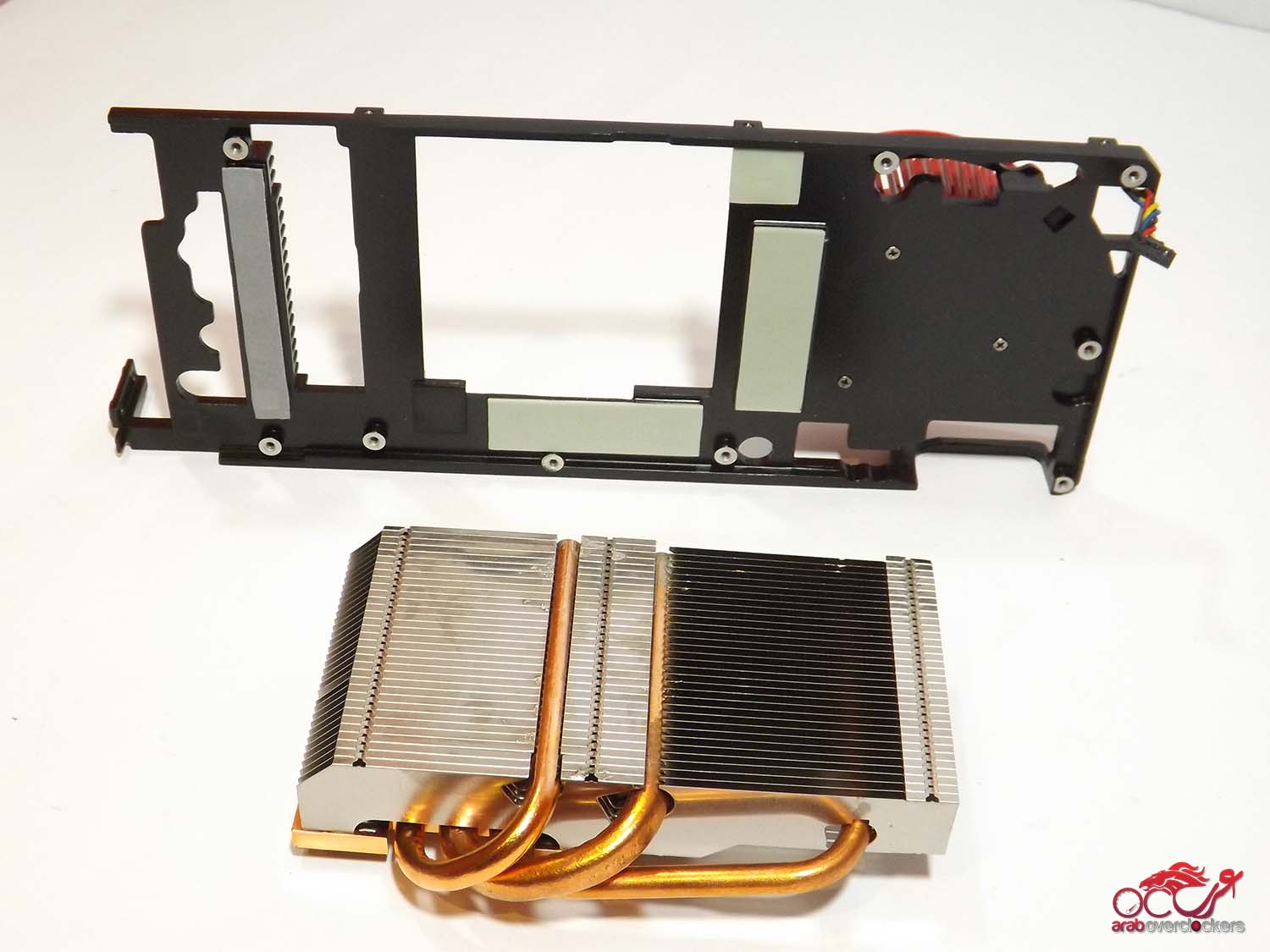 مبرد البطاقة قلبه مصنوع من النحاس ونري بقايا معجون التوصيل الحراري من ما تستخدمه AMD. كما نجد قطع مطاطيه تحيط بالمشتت علي ما بقي من الجسم المعدني من المشتت وهي مسؤله عن تبرد شرائح الذاكرة وكذلك منطقة دائرة الطاقة الخاصة بالمعالج.