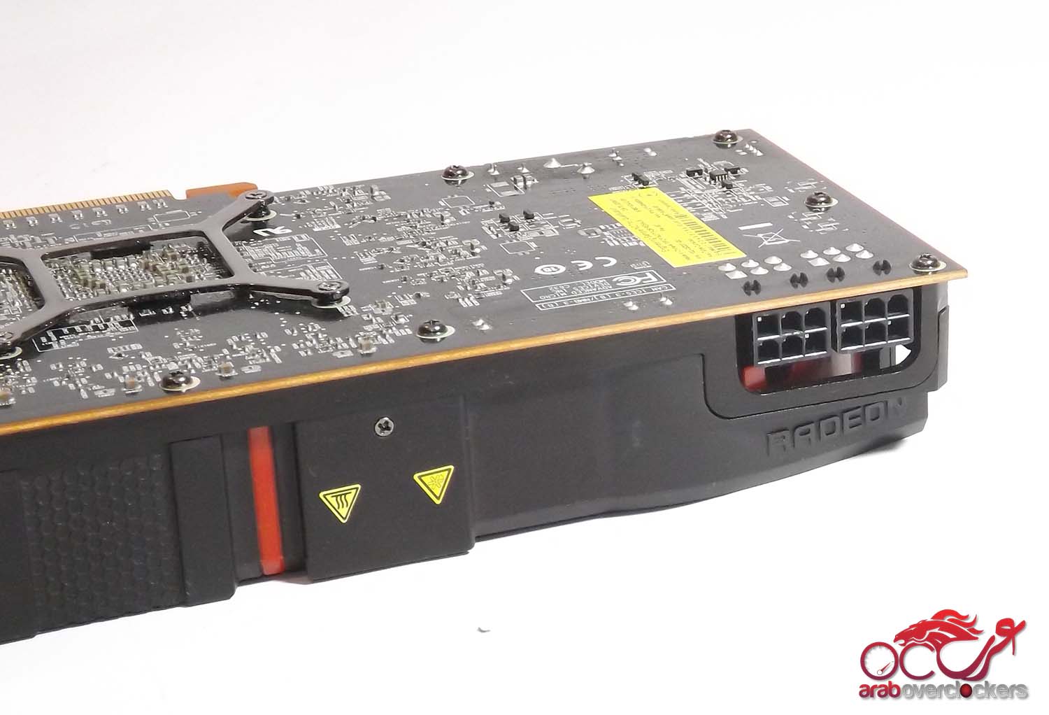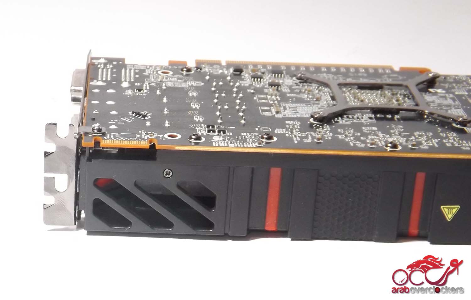 لوحة PCB من الخلف بلونها الأسود يظهر منها مكان تثبيت مشتت المعالج الرسومي كذلك براغي تثبيت الجزء العلوي كله باللوحة والتي سيتم فكها لنتعرف علي المكونات الداخلية.