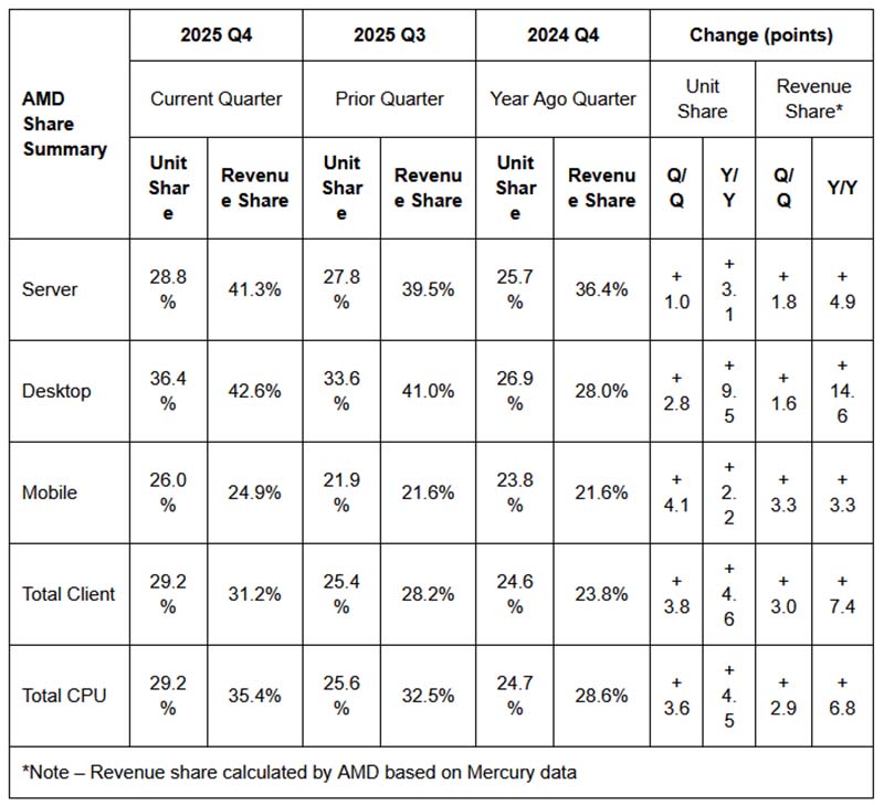 أصدرت شركة Mercury Research تقريرها للربع الرابع من عام 2025، مشيرةً إلى أن AMD أنهت العام بأداء قياسي، بعدما بلغت حصتها من إيرادات سوق الخوادم 41.3%، مدفوعة بالتوسع المتسارع لاعتماد معالجات EPYC في بيئات الحوسبة السحابية وقطاعات المؤسسات.