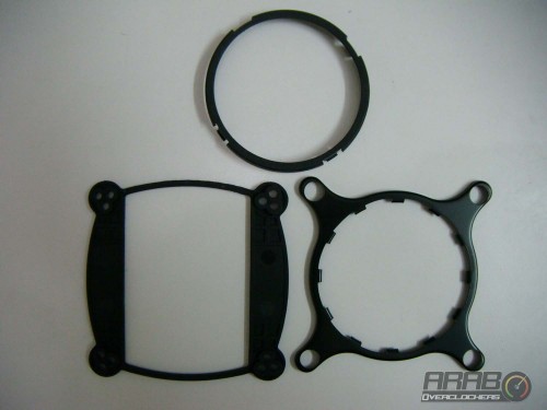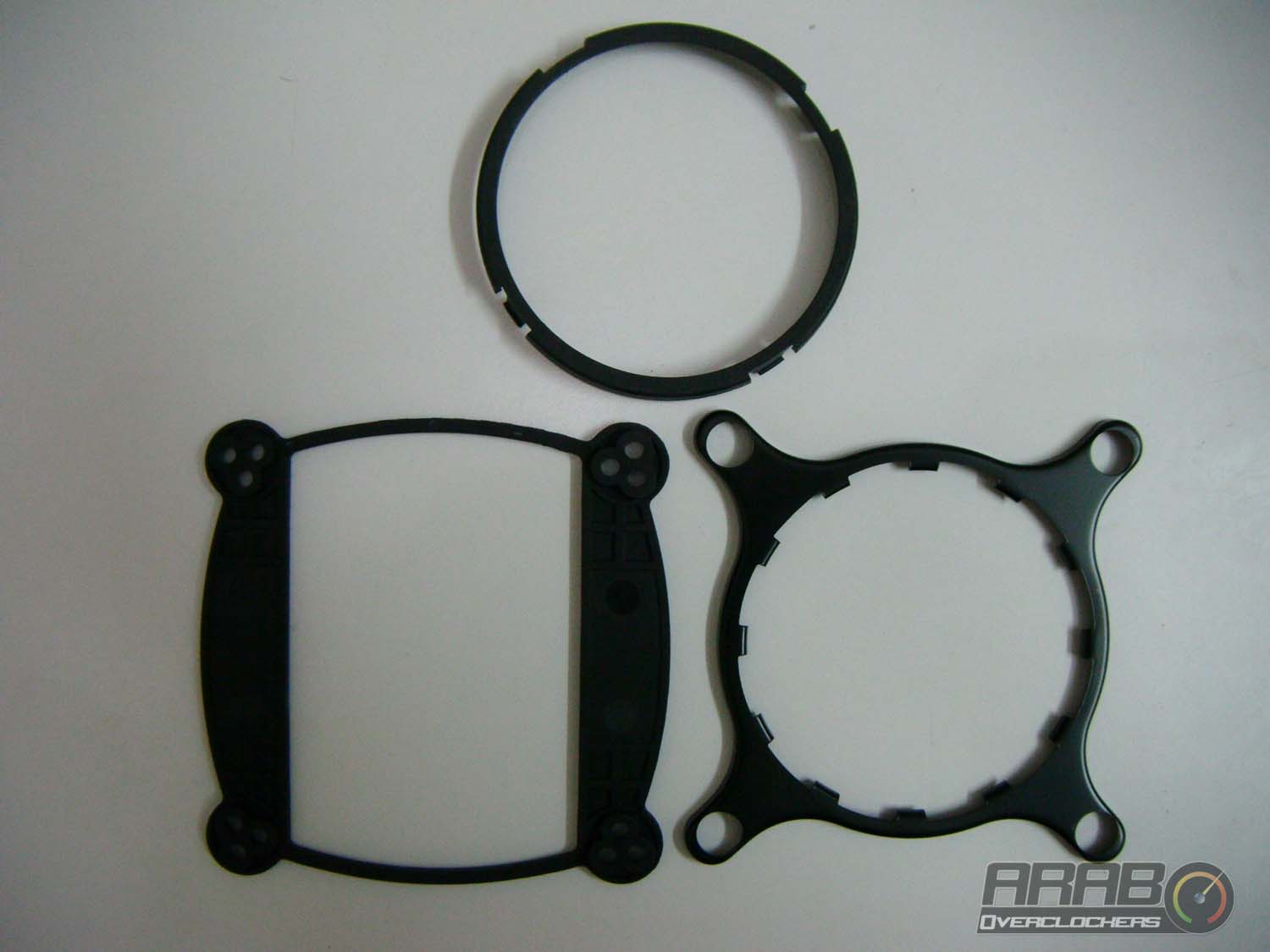 تظهر في الصوةر مجموعة تثبيت المشتت على منصات AMD ، هذه المجموعة تتكون من جزئان ، اول جزء وهو القاعدة التي تكون اسفل مقبس المعالج في الجهة الخلفية من اللوحة الام ، والجزء الثاني يكون اعلى المعالج ونلاحظ ان به زوائد بارزة للداخل كنا قد ذكرنا من قبل انها تقوم بالضغط على البلوك حين تركيبه بحيث تقوم بتثبيته في مكانه ومن ثم يقوم المستخدم بربط المسامير جيدا.