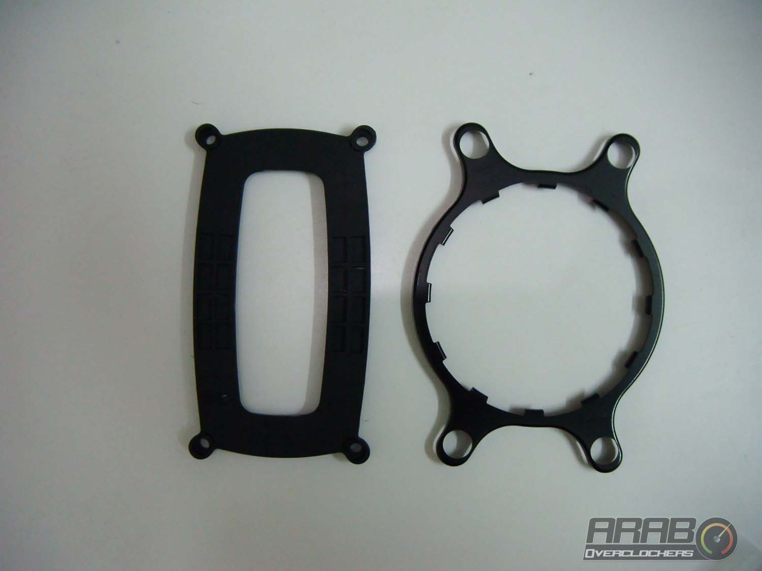 تظهر في الصوةر مجموعة تثبيت المشتت على منصات Intel، هذه المجموعة تتكون من جزئان ، اول جزء وهو القاعدة التي تكون اسفل مقبس المعالج في الجهة الخلفية من اللوحة الام ، والجزء الثاني يكون اعلى المعالج ونلاحظ ان به زوائد بارزة للداخل كنا قد ذكرنا من قبل انها تقوم بالضغط على البلوك حين تركيبه بحيث تقوم بتثبيته في مكانه ومن ثم يقوم المستخدم بربط المسامير جيدا.