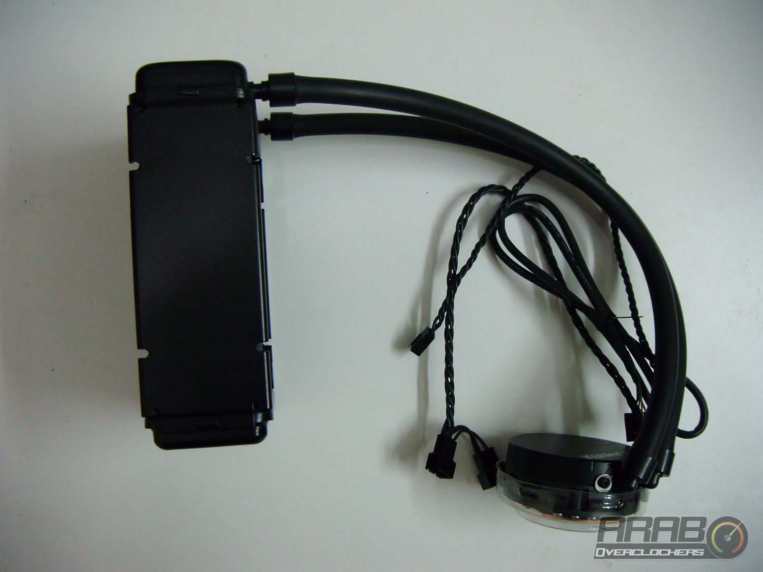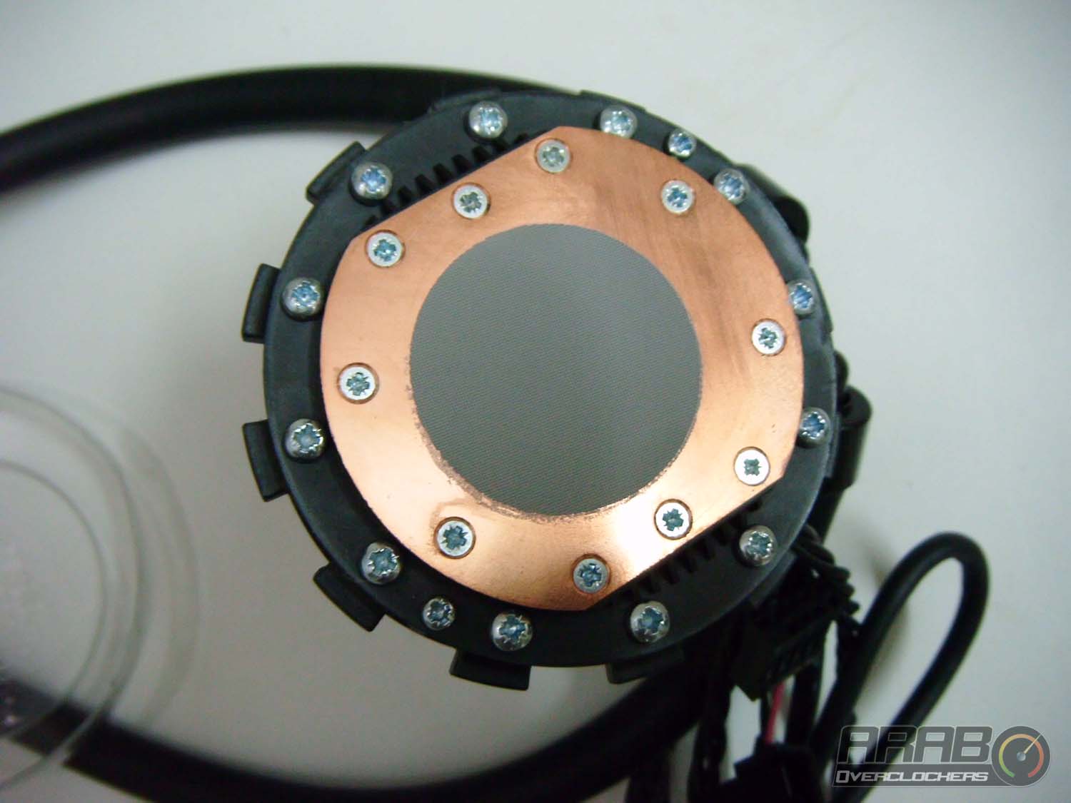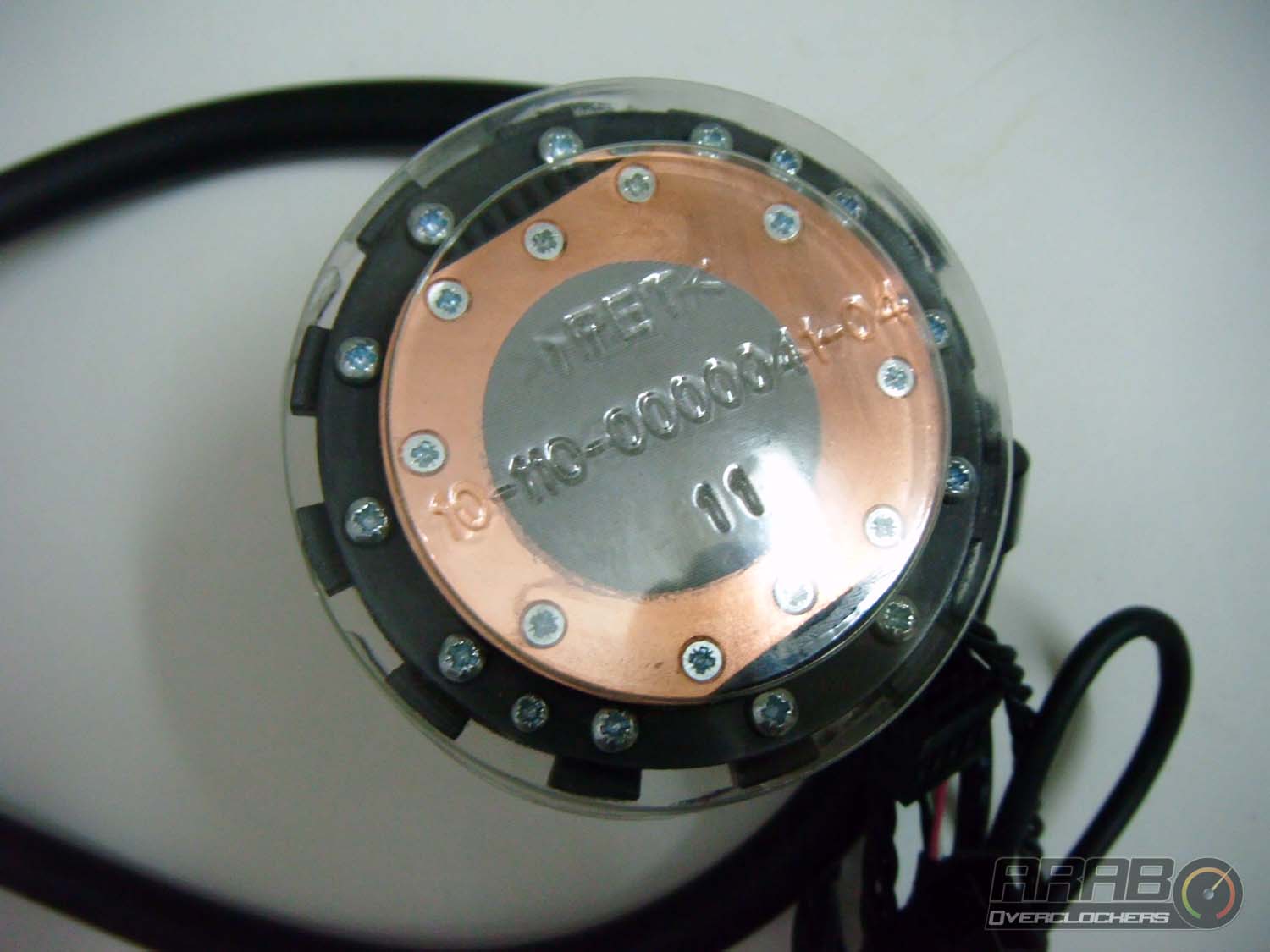هاهو البلوك يظهر لنا ، في العادة يكون البلوك قطعة من المعدن يتخللها انابيب التبريد ، اما في حالتنا هذه فهو قطعة من المعدن (النحاس) يعلوها الجزم الاسود البلاستيكي الظاهر في الصورة. هذا الجزء الاسود يحتوي على المضخة التي تقوم بعملية ادخل واخراج السائل المار بالسطح المعدني لتبريد المعالج وهي احدى ابداعات شركة Asetec ، دعونا نشرح دورة السائل لكي يفهم القارئ تميز هذه الوحدة !