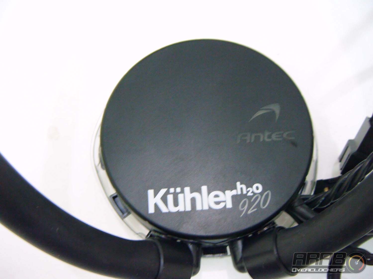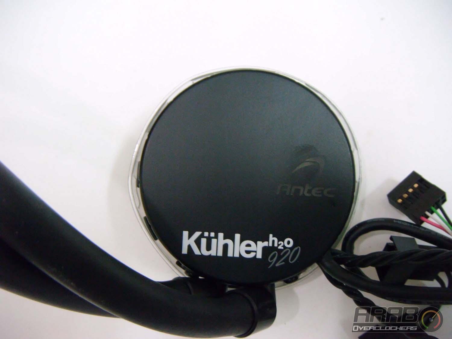 وكما تظهر لنا المضخة عن قرب ونجد اسم المشتت (Kühler H2O 920) واضحا عليها باللون الابيض بالاضافة الى شعار Antec وهو شفاف لانه يضيئ باكثر من لون (سنأتي على شرح هذه الجزئية تفصيليا) .