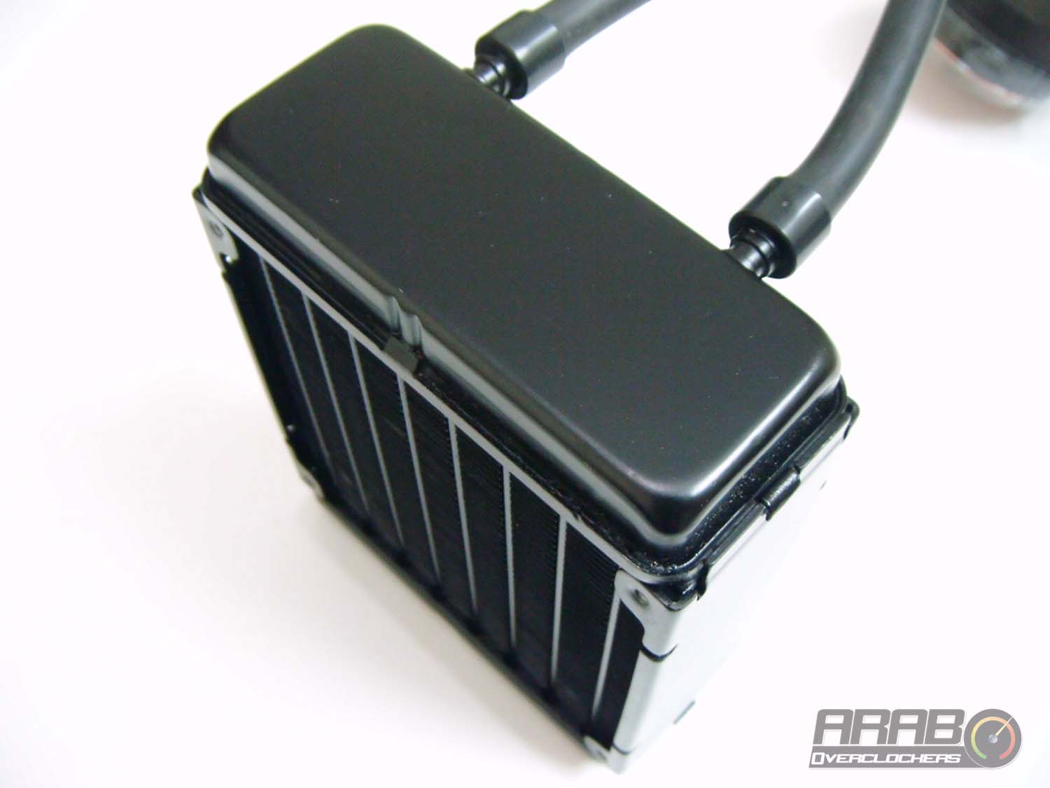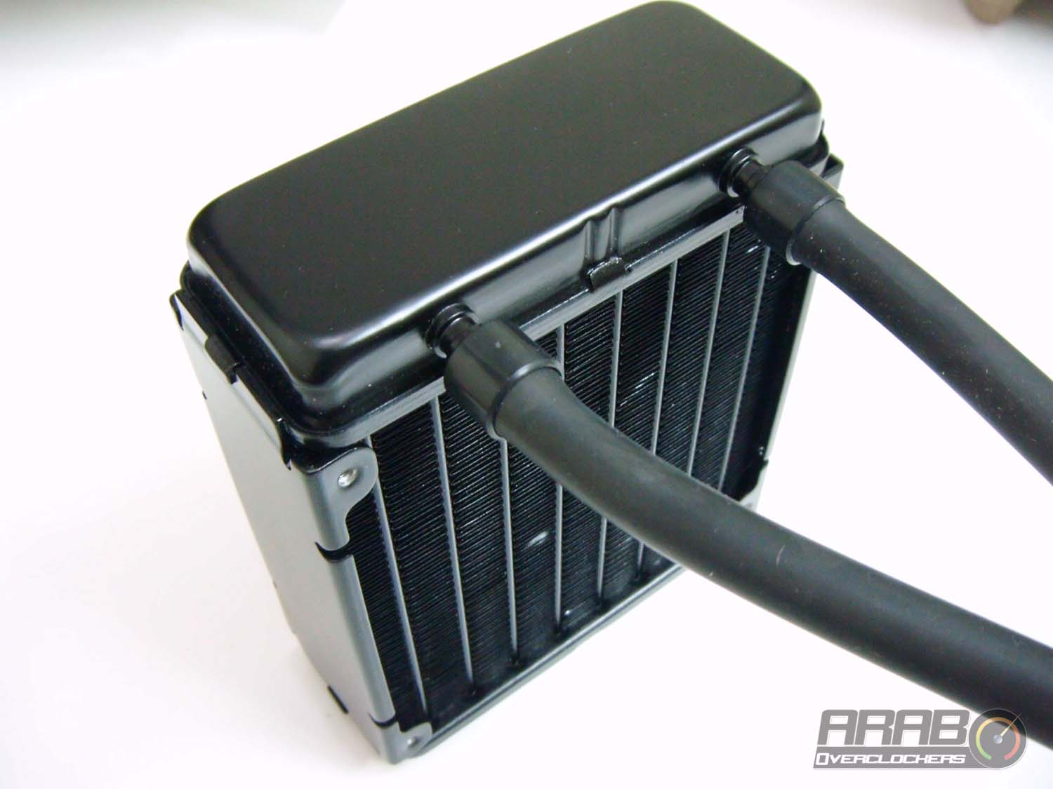 هذه الصورة تظهر لنا الراديتر من الامام وبه الانابيب التي تسمح بدخول السائل اليه والخروج منه باتجاه المعالج ، الراديتر بشكل عام مطابق في الشكل لاي راديتر اخر كالمستخدم في مكيفات الهواء او الثلاجات ولكن مع فارق الحجم . ونلاحظ اماكن تثبيت المروحة (4 اماكن) بقطر 120 مم ، ولا يمكن تثبيت مروحة ذات قطر اكبر من هذا .