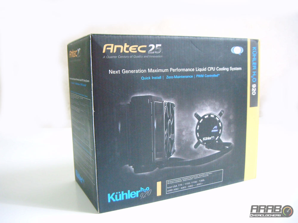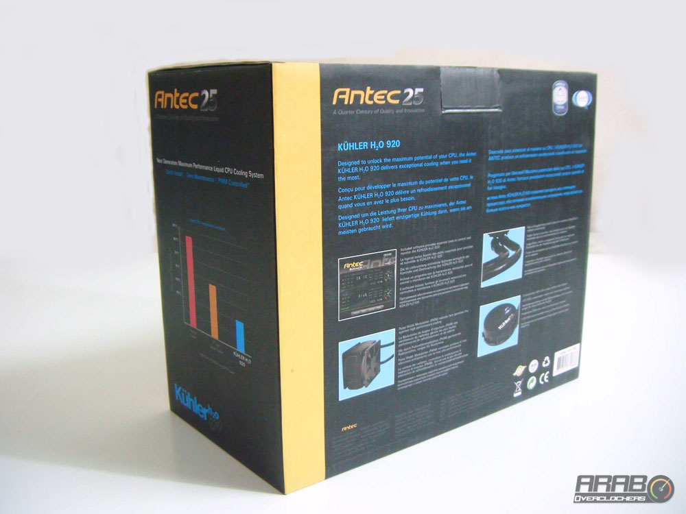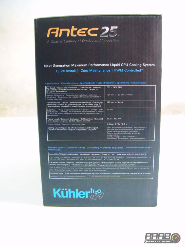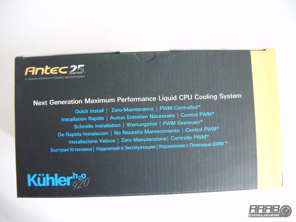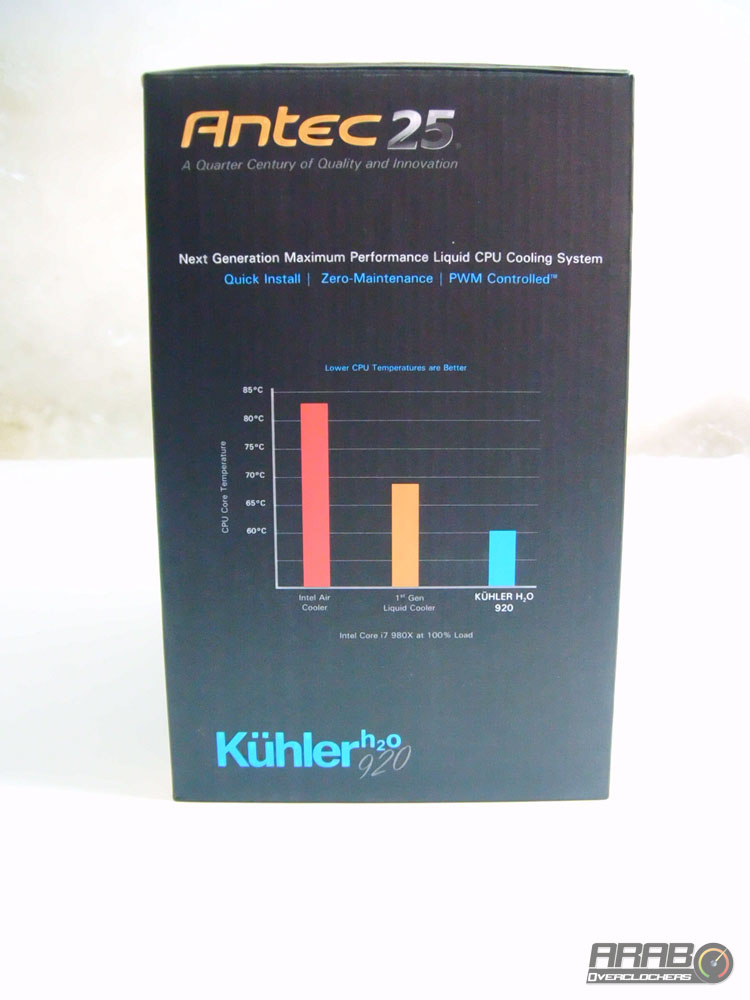 العلبة من الامام تظهر لنا صورة للمشتت بزاوية وبلوك المعالج من الاعلى (كما سنشاهده عند تثبيته) ، بالاعلى شعار Antec وبجواره 25 باللون الفضي ،على ماذا يدل هذا الرقم ؟؟ يدل على مرور ربع قرن على عمل الشركة ، ربع قرن مليئة بالابتكارات والجودة (كما هو مذكور اسفل الاسم) .