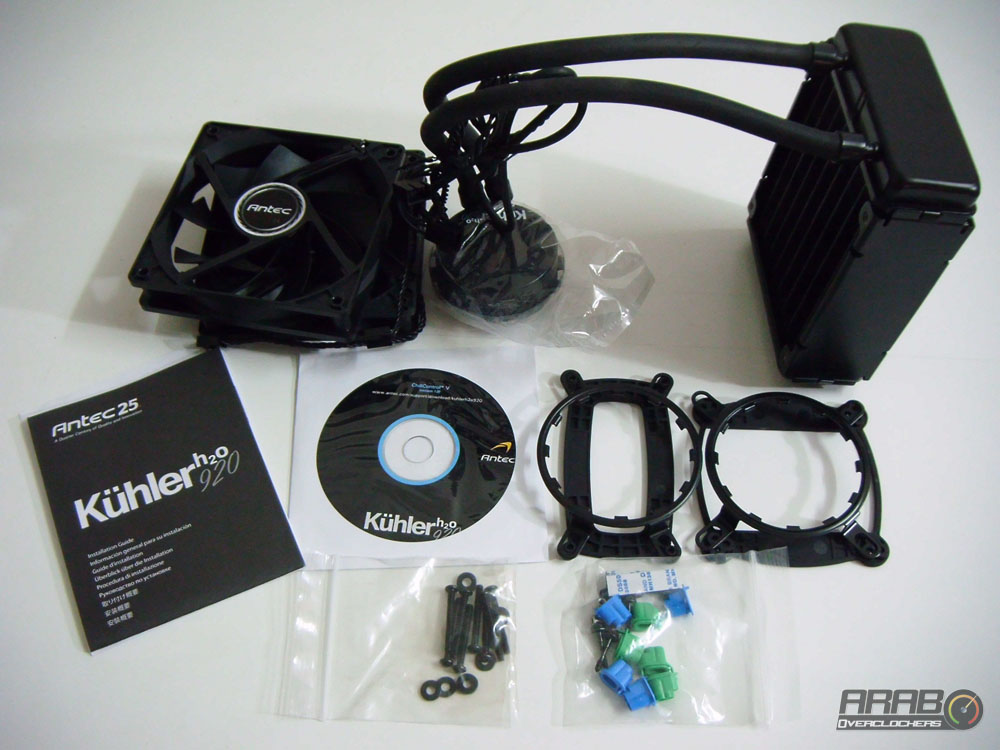 ونجد على الركن السفلي الايسر اسم المشتت Kühler H2O 920 وبجواره المنصات المتوافق معها المشتت من Intel و AMD .