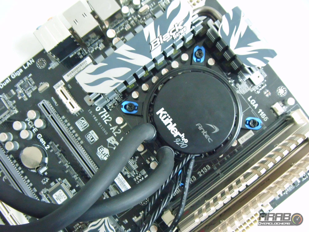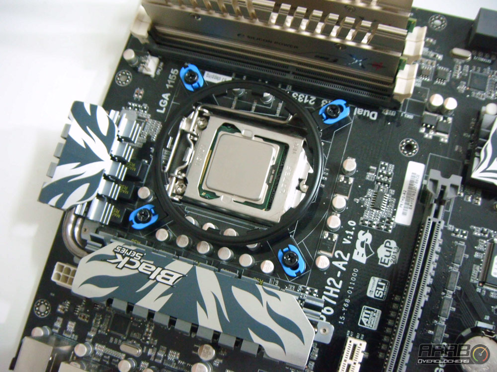 قمنا بتركيب مجموعة التثبيت الخاصة ب Intel كما يظهر في الصورة على منصة LGA1155 ، مع ملاحظة هامة لا تقم بتثبيت المسامير الاربعة الظاهرة في الصورة الى نهايتهم فقط لفة صغيرة لكي تقوم بعد ذلك بادخال البلوك ثم تكملة تثبيت المسامير .
