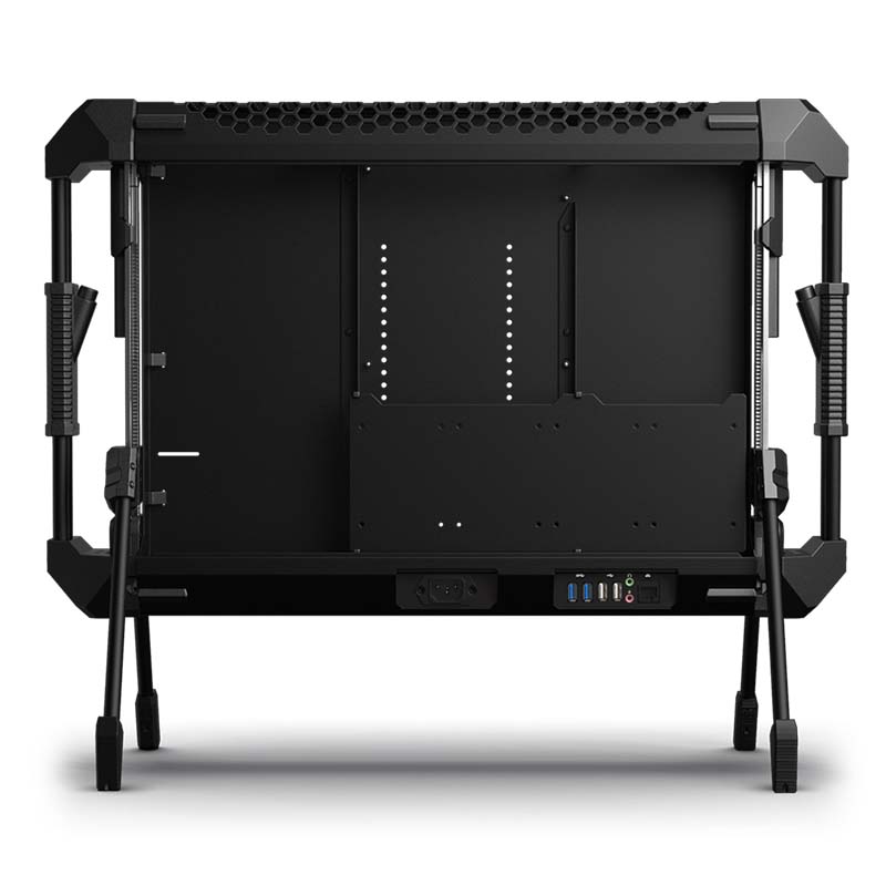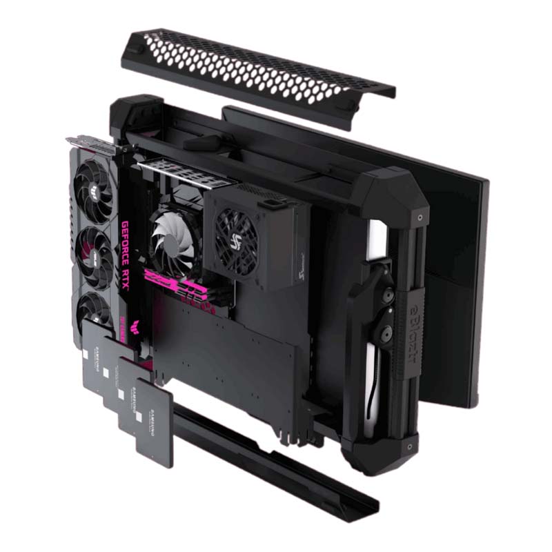 ومن الناحية العملية، يعتمد eBlaztr على نظام فريد من نوعه في التثبيت والطي، إذ يحتوي على أرجل قابلة للفتح والإغلاق في ثانية واحدة فقط، مما يسمح بإعداده بسرعة وربطه بشاشة عبر نظام التثبيت VESA، لتتحول الحقيبة الصغيرة إلى منصة ألعاب أو محطة عمل متكاملة في أي مكان. ومع ذلك، فإن تفرده لا يتوقف عند حدود التصميم الخارجي، بل يمتد ليشمل حلول التبريد الذكية التي تمثل تحدياً رئيسياً في الأجهزة المحمولة. فقد تم تصميم الهيكل مع فتحات تهوية واسعة في الخلف والجوانب تتيح أقصى قدر من تدفق الهواء، بينما تعمل بطاقة الرسوميات عبر كابل Riser لتوجيه الحرارة مباشرة إلى الخارج، الأمر الذي يحافظ على الأداء العالي دون اختناق حراري حتى عند تشغيل أكثر الألعاب أو التطبيقات تطلباً للموارد.