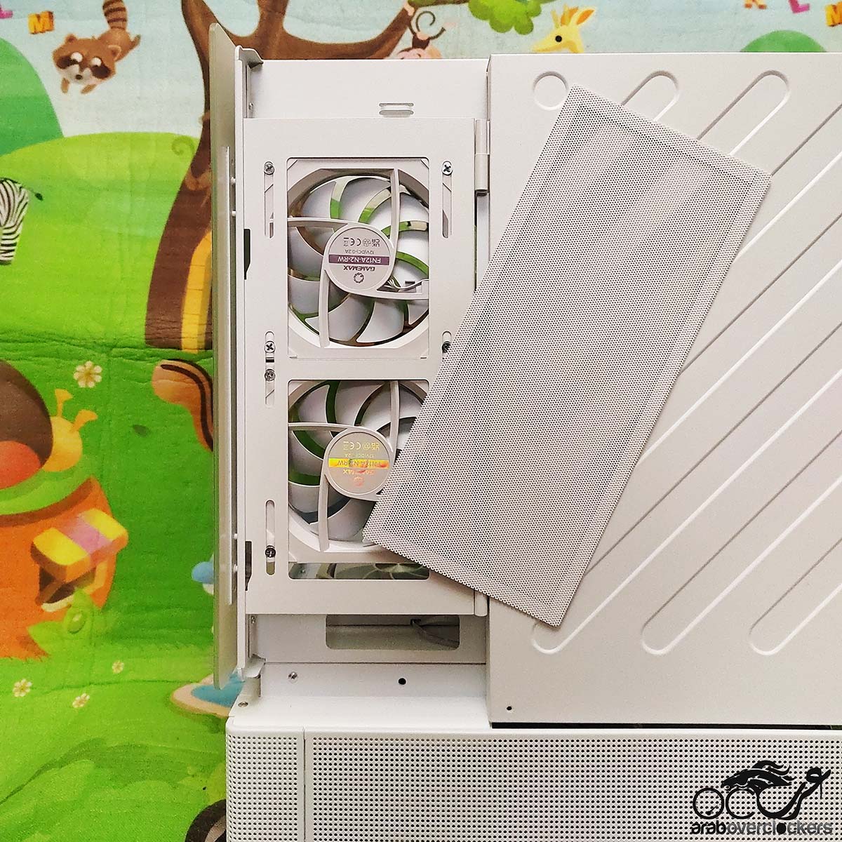 علاوة على ذلك، هناك فلتران مغناطيسيان للغبار، أحدهما في الأعلى والآخر على مدخل الجانب. يمكن العثور على فلتر غبار إضافي في الأسفل، لحماية مزود الطاقة من الغبار؛ ومع ذلك، لا توجد مروحة بين المقصورتين السفلية والعلوية. نظرًا لأن المراوح السفلية للمقصورة العلوية معدة للسحب، فسيتم إدخال الكثير من الغبار إلى الصندوق.