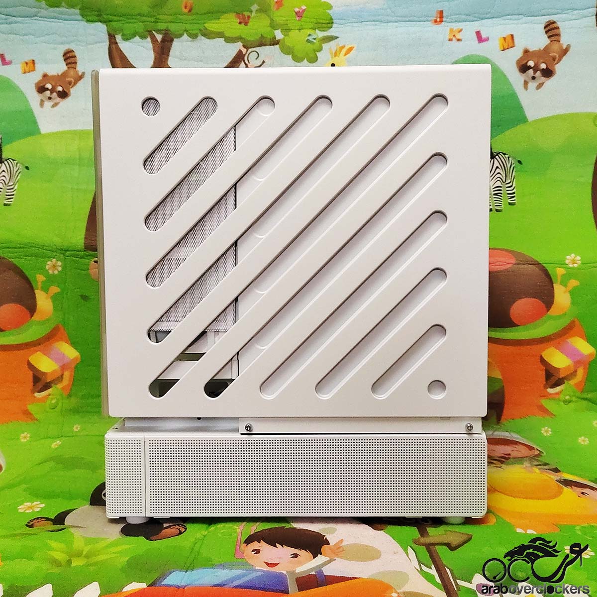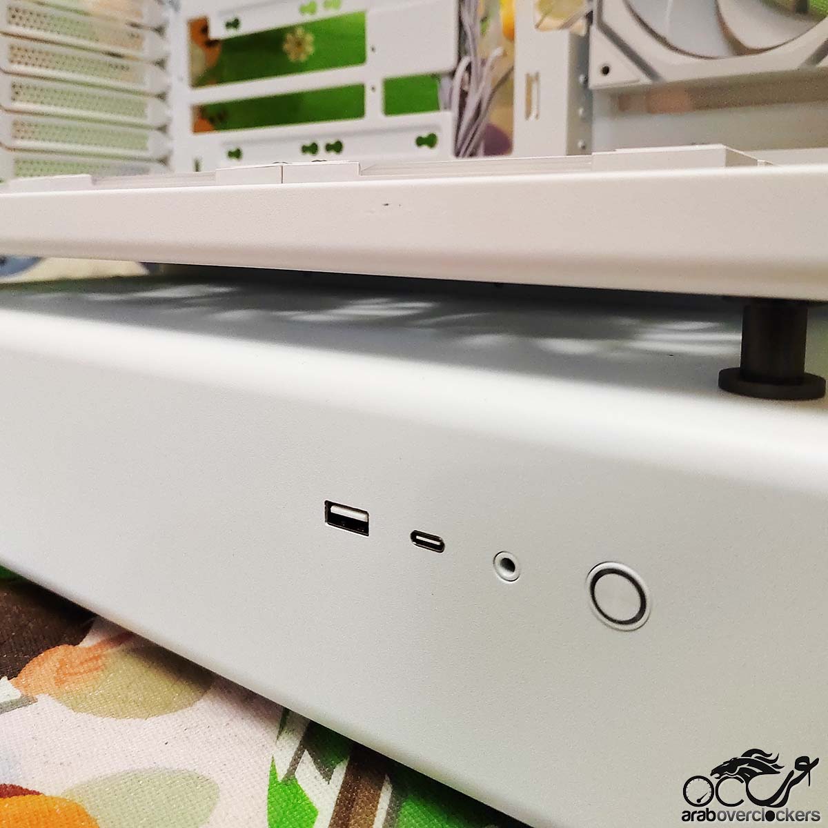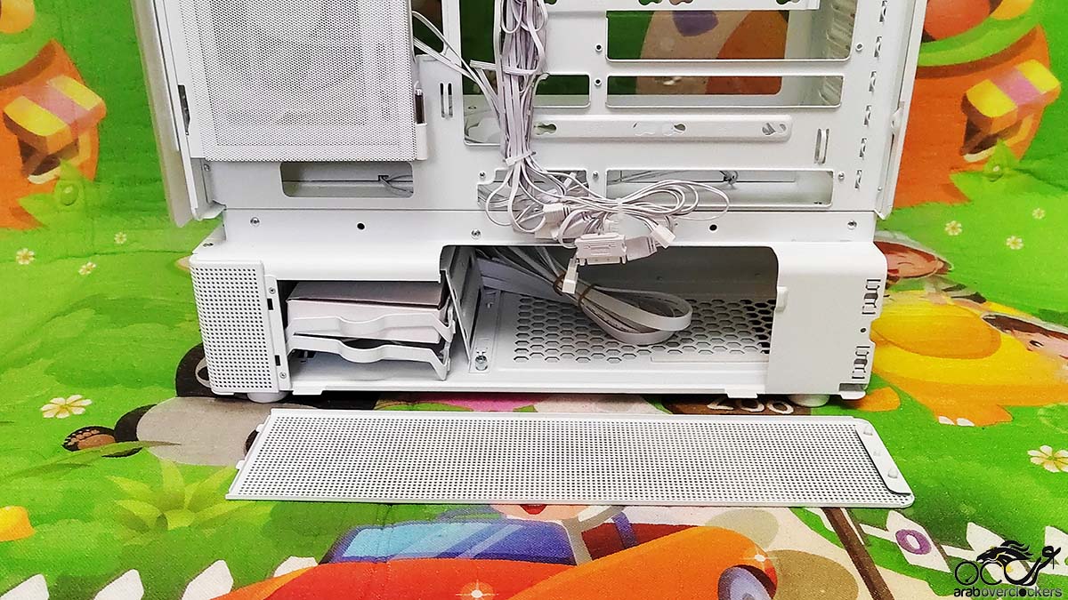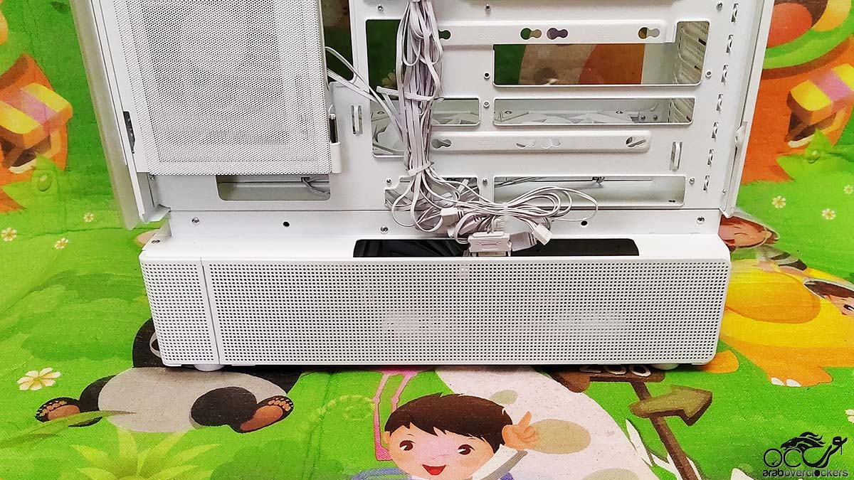 تحتوي الغرفة السفلية على منافذ الإدخال والإخراج على الجانب الزجاجي باتجاه الأمام. تتميز الجوانب الأخرى بتصميم لطيف للغاية يسمح بتدفق أكبر قدر ممكن من الهواء. ومع ذلك، نظرًا لأنها منفصلة عن بقية النظام، فهي لا تحتوي على مراوح. وهذا ليس سيئًا بالضرورة، حيث لا يوجد نقل مباشر للهواء الساخن بين وحدة إمداد الطاقة والمكونات الأخرى. يوجد مرشح غبار غير مغناطيسي إضافي في الجزء السفلي لمنع الغبار من الوصول إلى وحدة إمداد الطاقة.