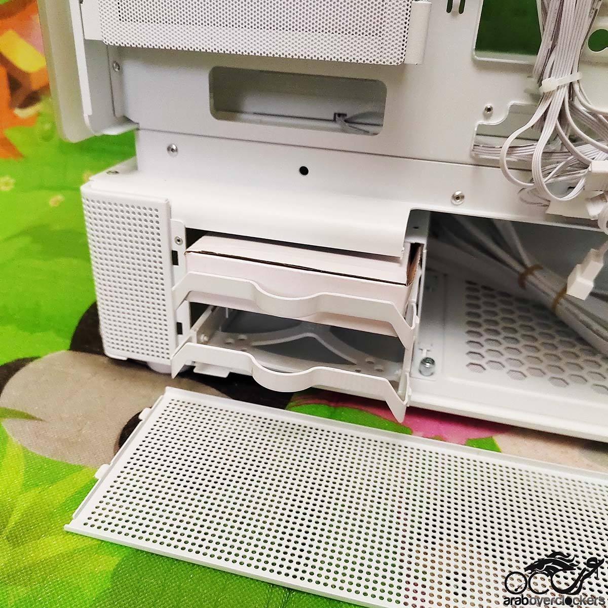 ستجد حجرة تخزين قابلة للإزالة في الحجرة السفلية، مع درجين بلاستيكيين للمحرك. تبدو الدرجان ضعيفتين وقد تنكسران بسهولة، ولكن يمكنك استخدامهما لمحركات 2.5 بوصة أو 3.5 بوصة، حيث توجد أماكن لكل منهما.