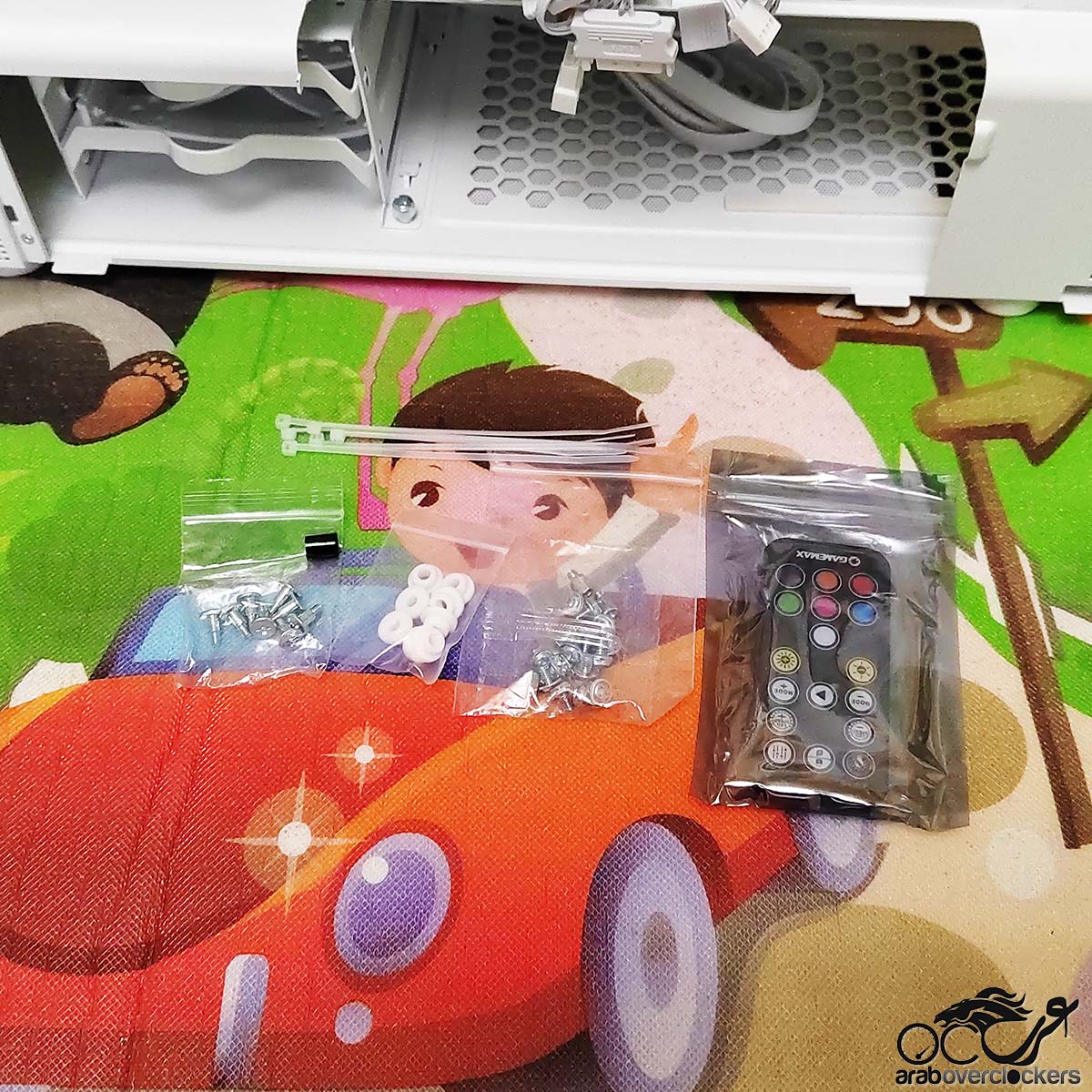 تتواجد الملحقات المجمعة في صندوق كرتوني أبيض صغير داخل الحجرة السفلية للصندوق، مما يحافظ على تنظيم الملحقات ويسهل الوصول إليها. بالإضافة إلى ذلك، يتضمن الصندوق جهاز تحكم عن بعد مخصص للتحكم في إضاءة RGB للمراوح المرفقة، مما يوفر للمستخدمين تجربة تخصيص مريحة وسهلة.