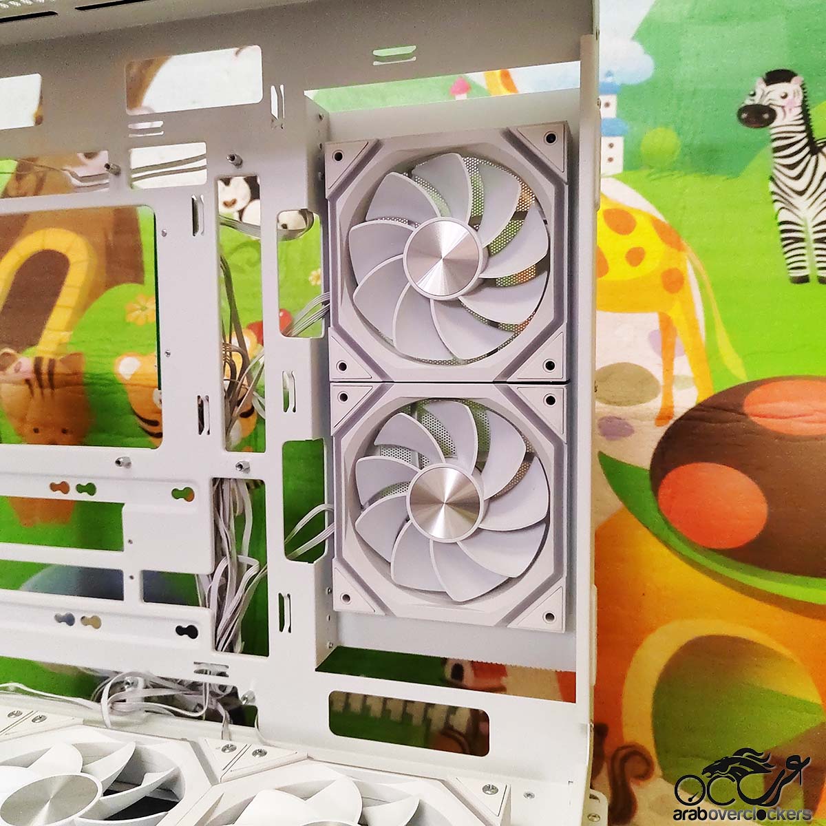يُجهّز الصندوق بستة مراوح RGB مثبتة مسبقًا، تعمل بكفاءة عالية على تبريد مكونات النظام، مع الحفاظ على مستوى ضوضاء منخفض للغاية، كما أظهرت اختبارات الضوضاء التي أجريناها. وتتميز هذه المراوح بتصميم مبتكر يحاكي تصميم مراوح Lian Li Uni Fan SLs الشهيرة، مما يعزز من كفاءة التبريد والأداء العام للنظام.