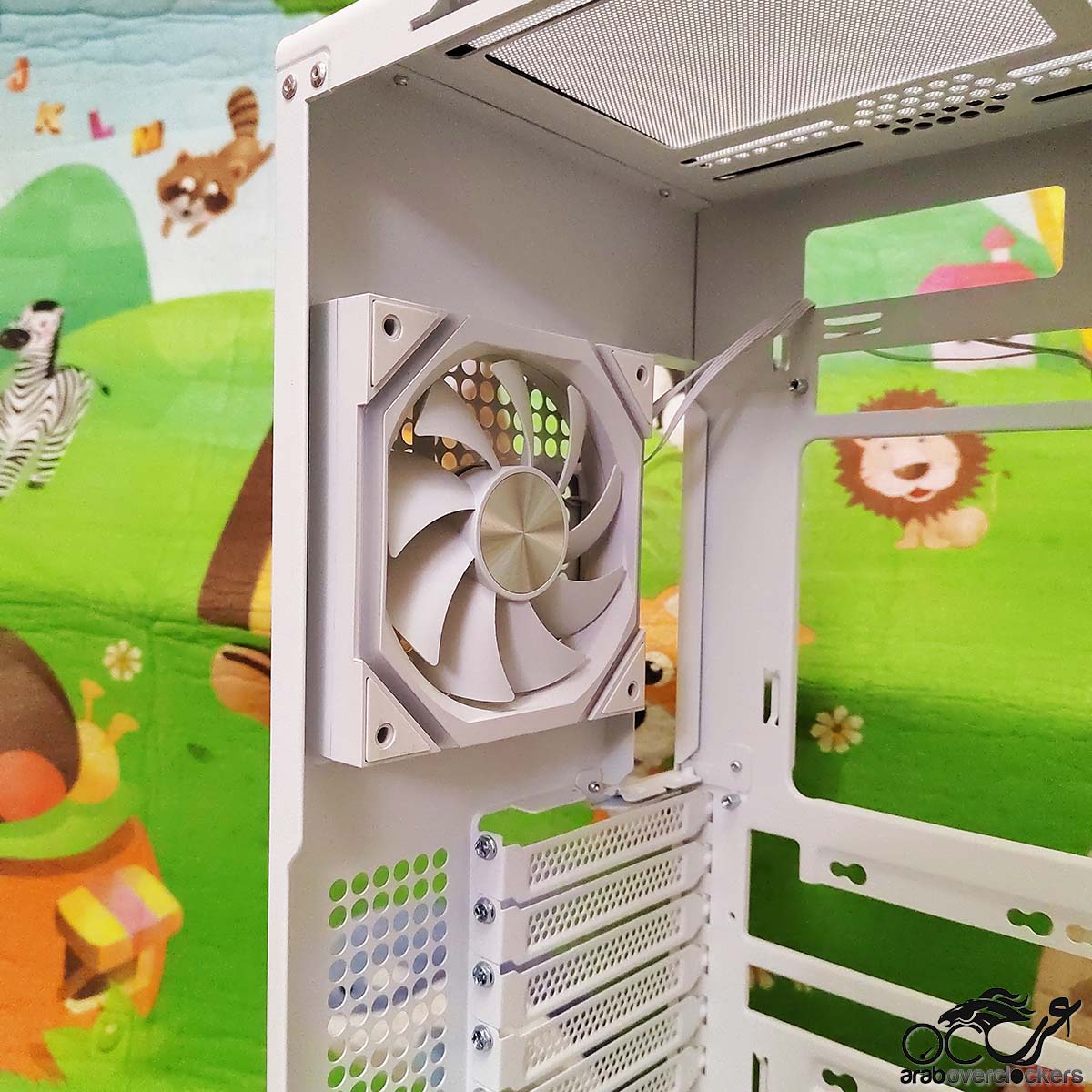 يأتي الصندوق مزودًا بستة مراوح مثبتة مسبقًا، خمسة منها من النوع العكسي (FN12A-N2-R) ومروحة العادم الخلفية من النوع القياسي (FN12A-N2). تتميز هذه المراوح بتصميم إضاءة RGB فريد، حيث تقع مصابيح LED حول إطار المروحة بدلاً من الشفرات، مما يخلق تأثيرًا بصريًا مذهلاً يشبه تصميم مراوح Lian Li Uni Fan SL.