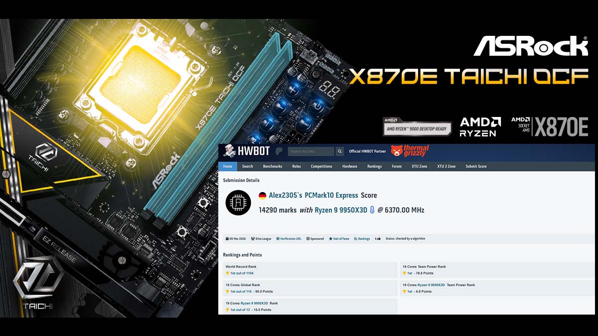 وقد تمكن كاسر السرعة المحترف Alex2305 من دفع أداء النظام إلى مستوى غير مسبوق باستخدام اللوحة ASRock X870E Taichi OCF إلى جانب المعالج القوي AMD Ryzen 9 9950X3D، حيث سجل النظام 14290 نقطة في اختبار PCMark 10 Express، محققًا بذلك المركز الأول عالميًا على منصة HWBOT المتخصصة في تسجيل أرقام كسر السرعة.