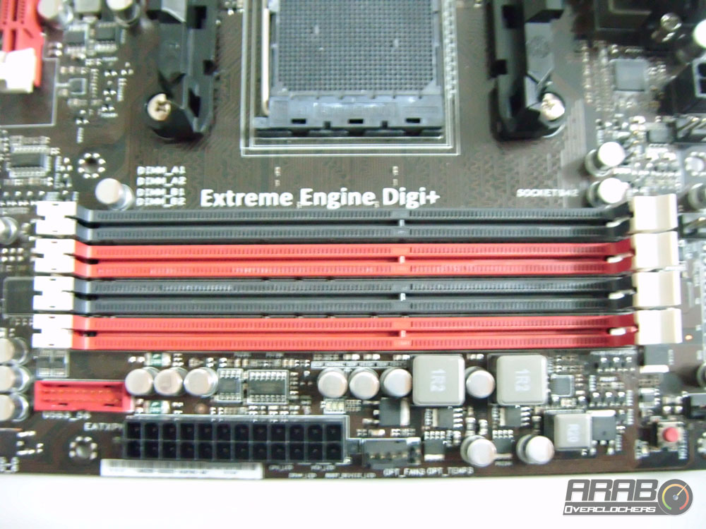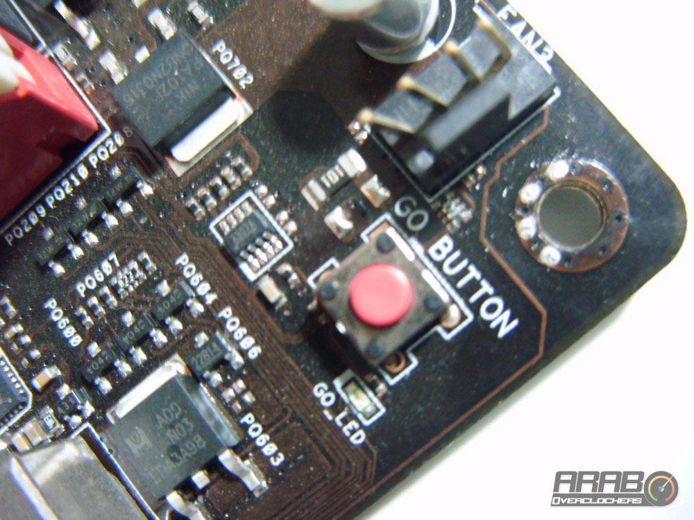 بجوار شقوق الذاكرة يوجد زر صغير يسمى Go Button كما هو ظاهر في الصورة ، حين الضغط عليه اثناء اقلاع اللوحة فأنه يقوم بفحص الذاكرة MemOK ، اما اذا تم استخدامه اثناء عمل النظام فأنه يقوم برفع تردد تشغيل الذواكر اليا لاعلى تردد يحقق الثبات اثناء العمل .