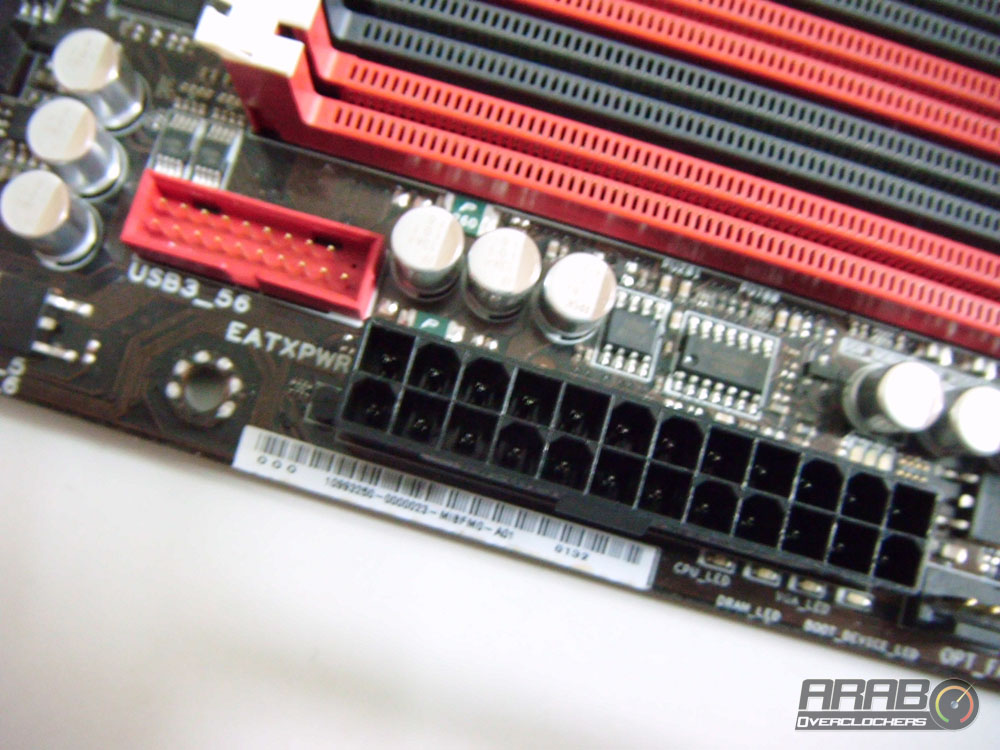 وبالاسفل نجد مقبس تزويد اللوحة بالطاقة 24 بن (ابرة) ، وهذا المقبس معياري في جميع اللوحات الام وبجواره منفذ USB 3 اضافي للتوصيل .