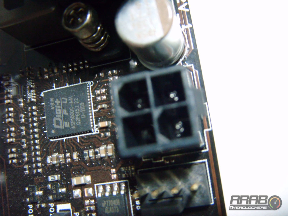 ما هذا ؟! سبق ان اشرنا الى منفذ تغذية المعالج بالطاقة ذو الثمان ابر وفوجئنا بهذا المنفذ ذو الاربعة ابر والذي وضعته ASUS خصيصيا لتضمن حصول المعالجات ذات الثمان انوية على الطاقة الازمة للقيام بمهامها على اكمل وجه مهما كانت الطاقة الازمة للتشغيل عالية .