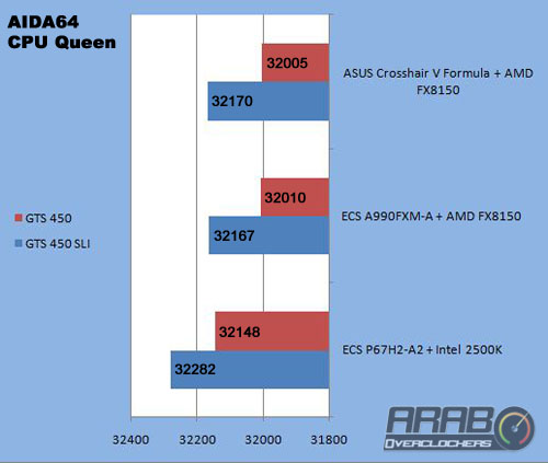 تم استخدام اختبار CPU Queen المدمج ببرنامج AIDA64 ، الفروق ليست بالكبيرة في وضعية بطاقة واحدة ووضعية SLI ، الفروقات بين اللوحات متقارب بشكل كبير .