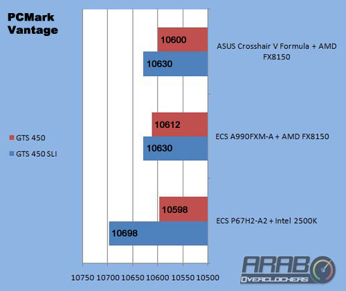 من جديد نتائج الاختبار متقاربة ويمكن وصفها بالمتساوية بين لوحتنا من ASUS وبقية اللوحات المختبرة . فارق الاداء في اختبار PCMark Vantage عدة نقاط فقط وذلك راجع إلى ان هذا الاختبار يستخدم قوة المعالج اكثر من البطاقات الرسومية .