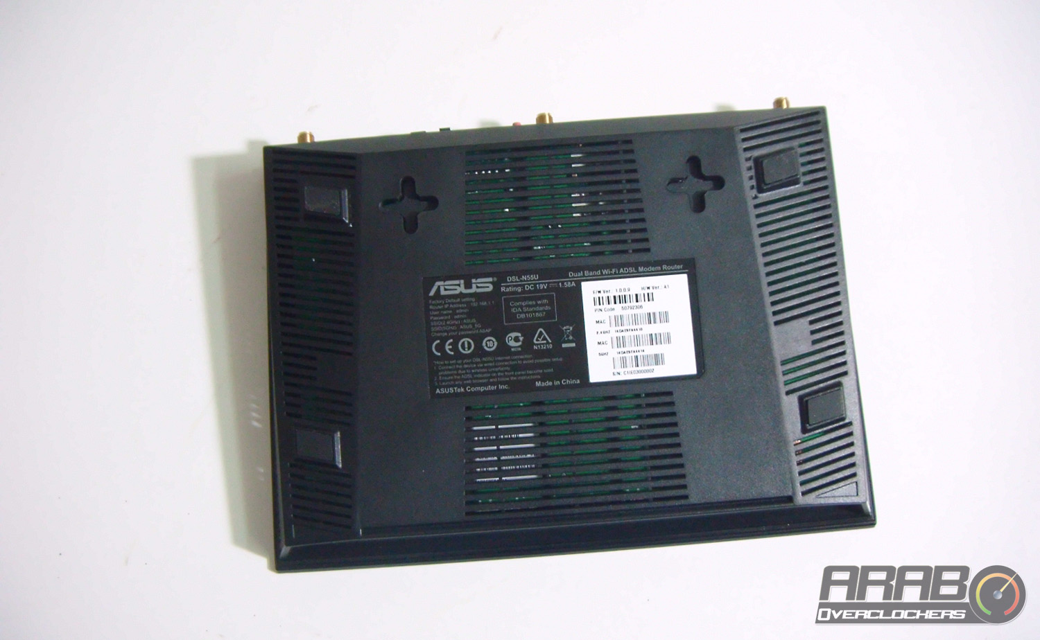 هذه صورة للمودم من الاسفل ويظهر فيها ملصق المعلومات في المنتصف ، وعلى الحوانب الاربعة هناك اربعة مساند (ارجل) مطاطية يتم الارتكاز عليها حين وضعه على المكتب ، وهناك فتحات تشبه علامة (+) هذه الفتحات خاصة بتثبيت المودم على الحائط . ونلاحظ ان المودم من الاسفل به العديد من الفتحات الطولية ، هذه الفتحات الكثير تسمح للهواء بالمرور الى داخل المودم حيث يقوم بتبريد القطع الداخلية لان الحرارة العالية تمثل مشكلة كبيرة لمثل هذه المكونات .
