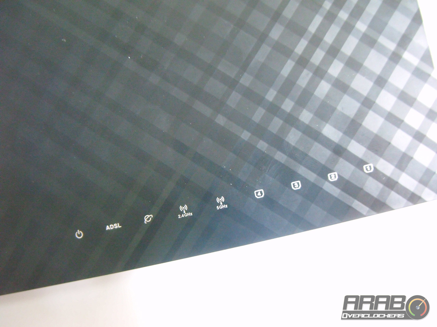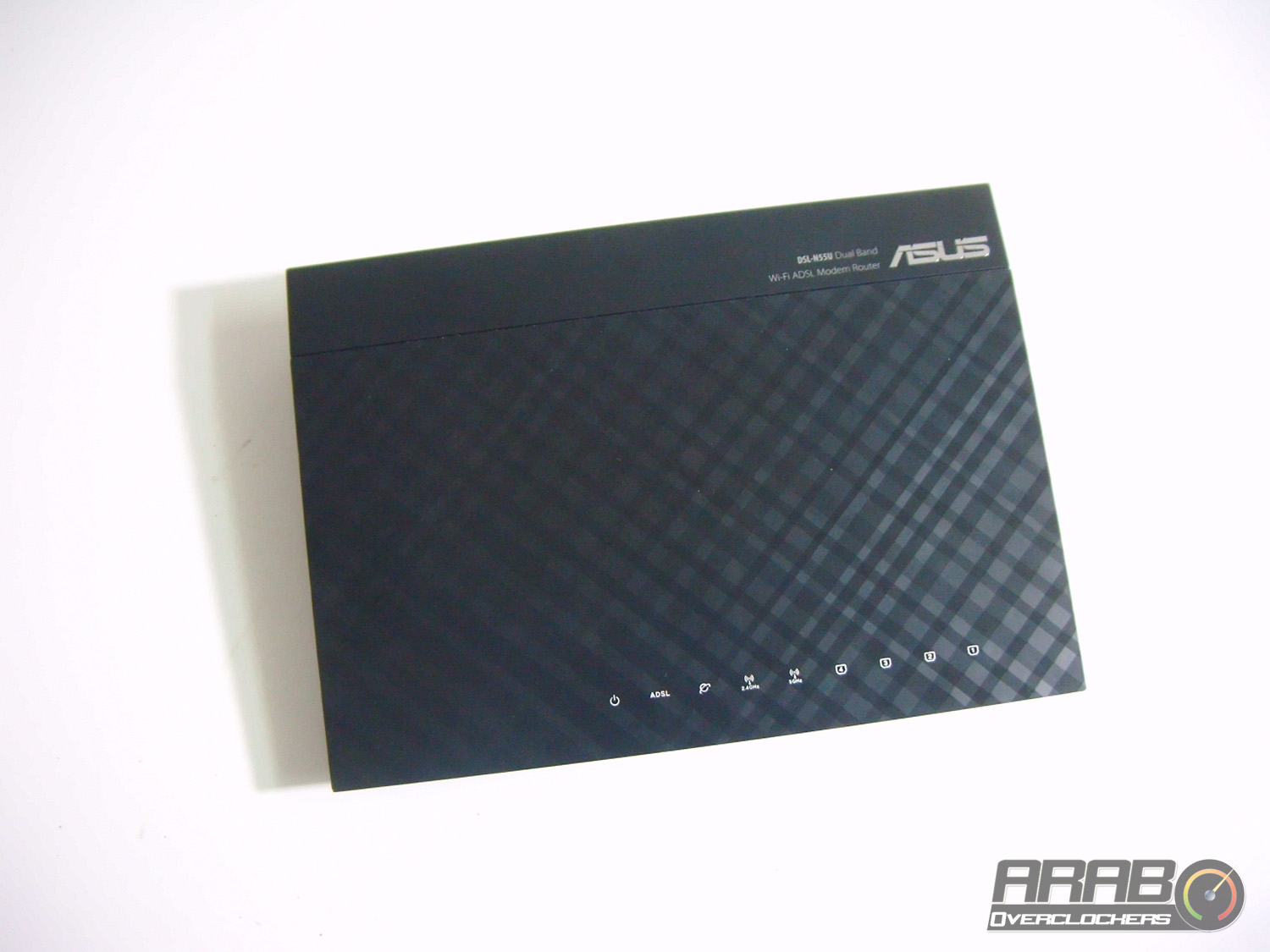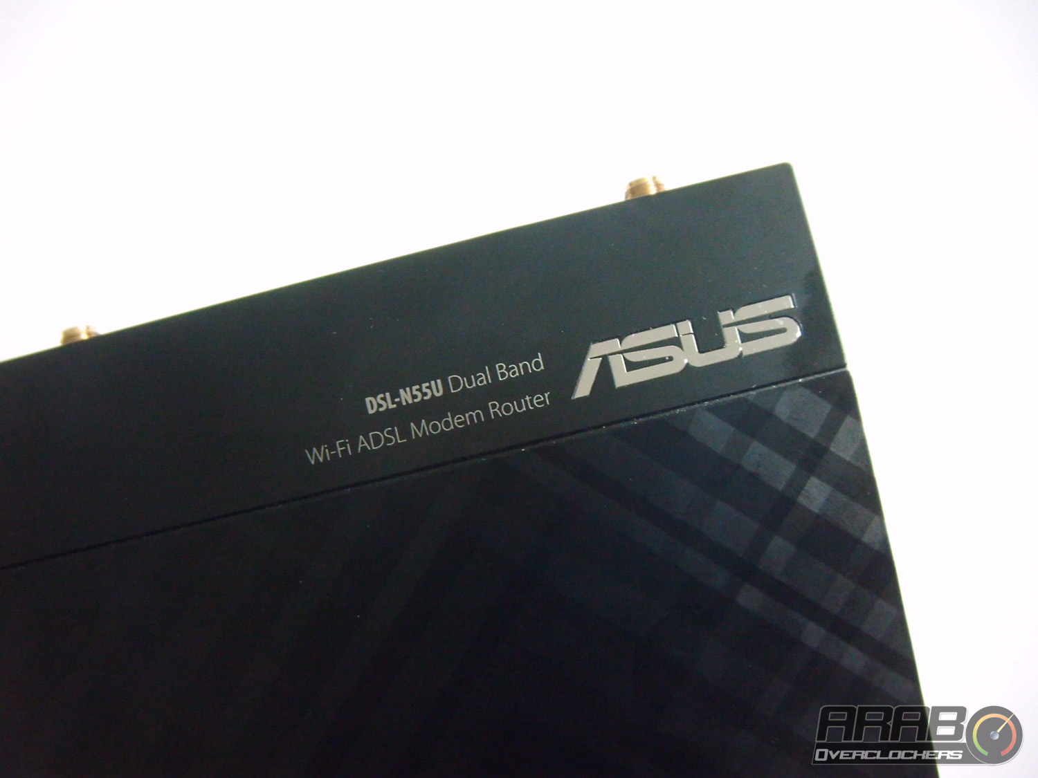 اعلى واجهة المودم يظهر لنا شعار واسم ASUS بارزا باللون الفضي وبجانبه موديل المودم DSL-N55U ، واسفل منه تظهر عبارة مودم “Modem” للعمل على خط المشترك الرقمي “ADSL” وموجه لاسلكي “Router” .