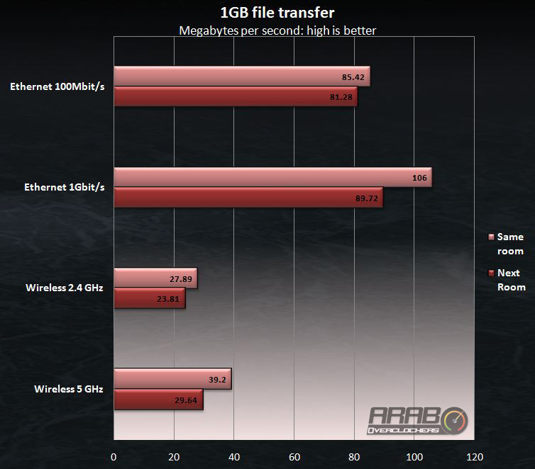 يرجى ملاحظة ان اختبار سرعة نقل البيانات بواسطة معيار Ethernet 1Gbit/s تعتمد على توافر كابلات تعتمد نفس سرعة النقل ، وهذه الكابلات لا تتوافر لدينا لذلك اعتمدنا على كابلات Cat5 التي تحد سرعة النقل بحدود 100 ميجابت/الثانية .