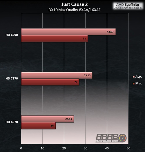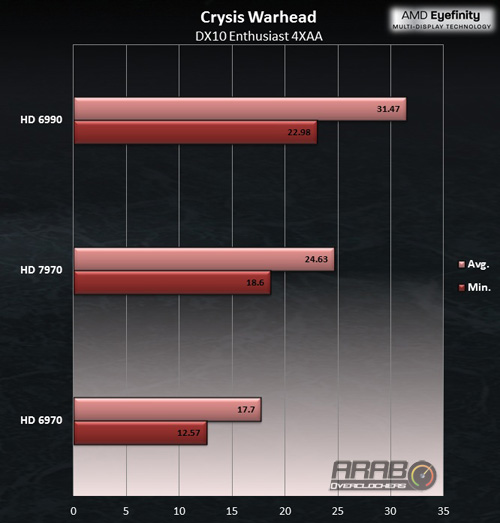 تفوقت 7970 على 6970 بنسبة 35.2% وهي أقل من نسبة الزيادة مع دقة شاشة واحدة ولكن في الحد الأدنى الزيادة قدرها 68.8% وهي تقريباً نفس نسبة الفارق في الحد الأدنى مع شاشة واحدة