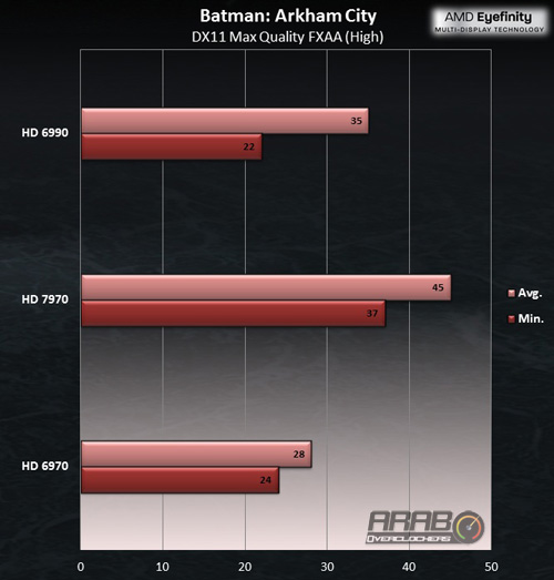 مرة أخرى تقدم بطاقة واحدة HD 7970 معدل إطارات مريح للغاية مع هذه اللعبة وثلاث شاشات ولم يفت في عضدها العمل على أعلى جودة صورة ممكنة