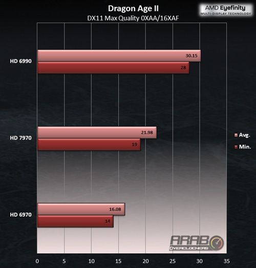 تفوقت 7970 على 6970 بنسبة 36.7% ونسبة الزيادة هذه أعلى ب 6.7% منها مع دقة شاشة واحدة وفي الحد الأدنى الزيادة قدرها 35.7% وهي أعلى من نسبة الفارق في الحد الأدنى مع شاشة واحدة بفارق 15.7%