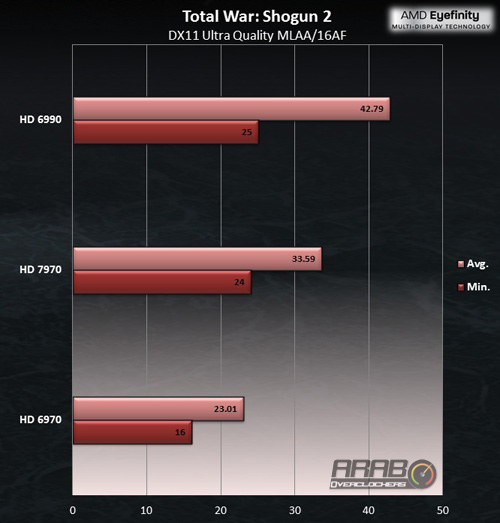 تفوقت 7970 على 6970 بنسبة 46% وهي نفس نسبة الزيادة مع دقة شاشة واحدة تقريباً وفي الحد الأدنى الزيادة قدرها 50% وهي أعلى من نسبة الفارق في الحد الأدنى مع شاشة واحدة بفارق طفيف