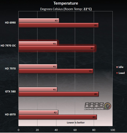 مع كسر سرعة بطاقة HD 7970 زادت درجة الحرارة درجتين مئويتين فقط وحتى مع هذا ظلت أقل بدرجتين من أقل بطاقة في الحرارة وهي HD 6970