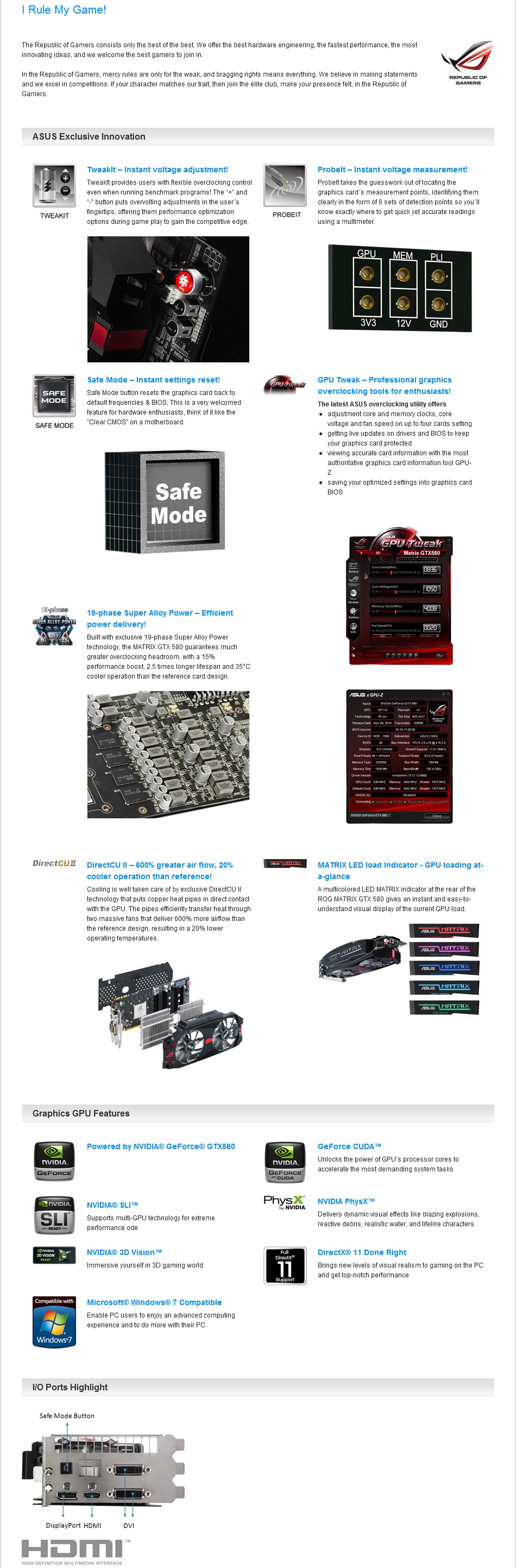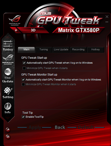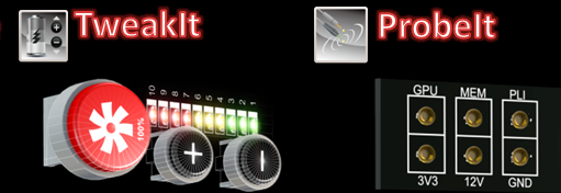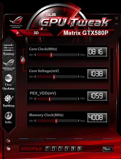 برنامج كسر السرعة المميز من Asus وهو مبني على برنامج Riva Tuner ويتيح للمستخدم التحكم الكامل في البطاقة من كسر سرعة وضبط المروحتين كل على حدة بالإضافة إلى تعديل الفولتات ومراقبة درجات الحرارة وعمل بروفايلات, وكل هذا يواجهة رائعة من Asus تتماشى مع موديل ROG باللونين الأسود والأحمر .