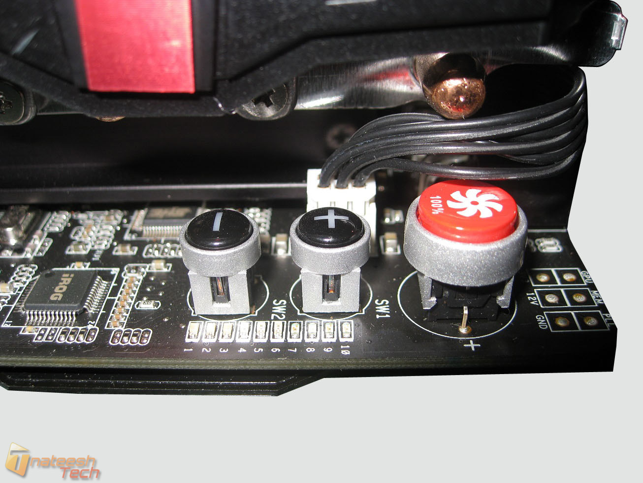 زر تشغيل المروحة على 100% مع زري رفع وخفض الفولت بعشر تدرجات بألوان مضيئة مختلفة ، بجوار زر المروحة نجد نقاط قياس الفولت وهي في موضع سهل الوصول إليه مع البطاقة وهي تعمل ، وفي الأسفل نجد رقاقة iROG المسؤولة عن التحكم في هذا الجزء بشكل أليكتروني .