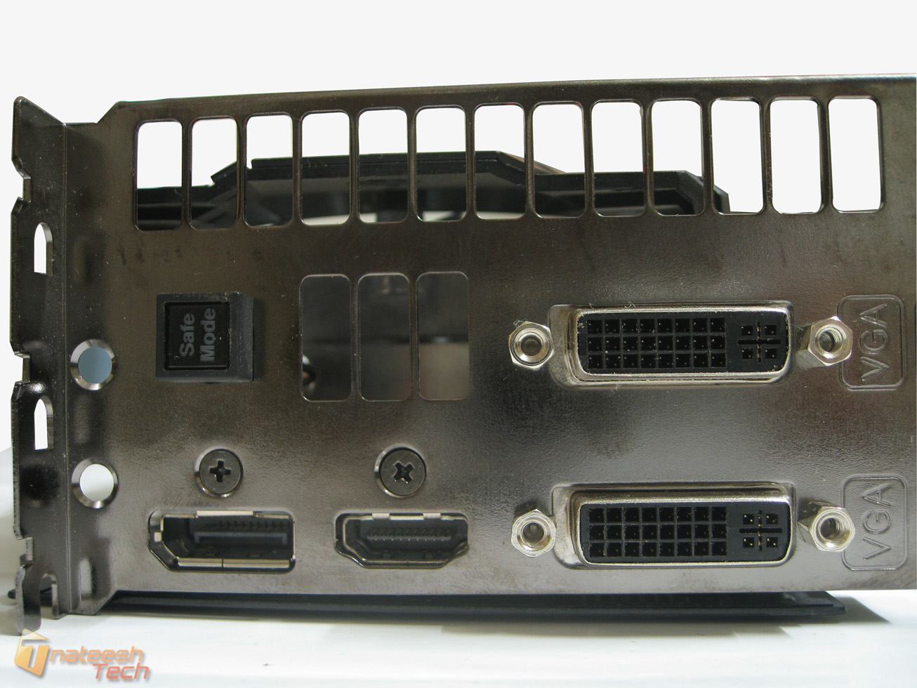 في الخلف نجد مخارج التوصيل بالشاشات وهي عبارة عن مخرجي DVI ومخرج HDMI ومخرج DisplayPort, بالإضافة إلى زر ال Safe Mode أو الوضع الآمن