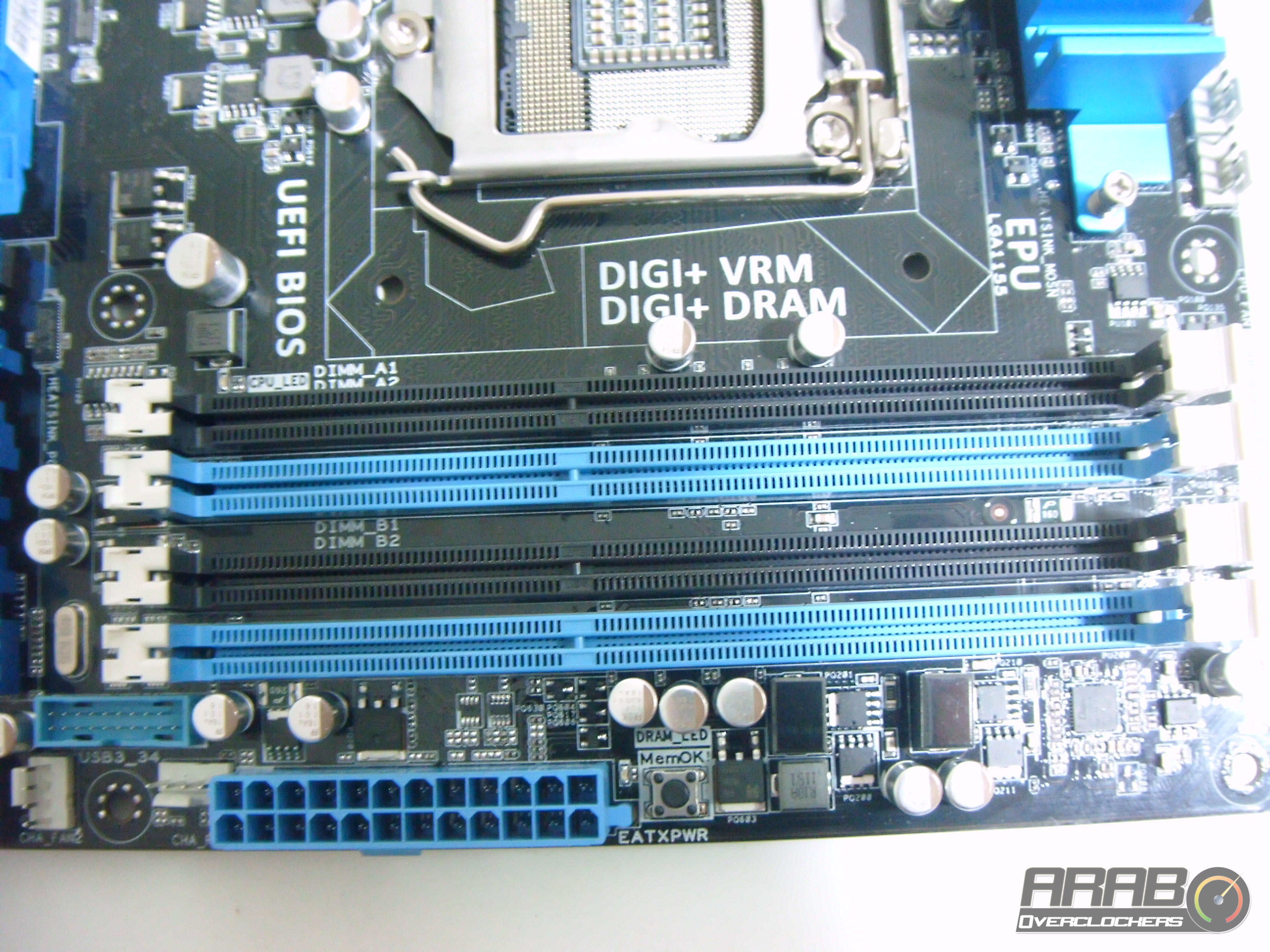 كما نرى فهناك اربعة شقوق مخصصة لتركيب الذواكر من نوع DDR3 ، تدعم خاصية Dual Channel (كما في الجيل الاقدم) ولكن هذه المرة تأتي بدعم تركيب شرائح ذاكرة بمجموع 64 جيجا لكل الشقوق . تأتي الشقوق باللونين (الاسود و الازرق) للتسهيل على المستخدم حيت تركيب اطقم الذاكرة .