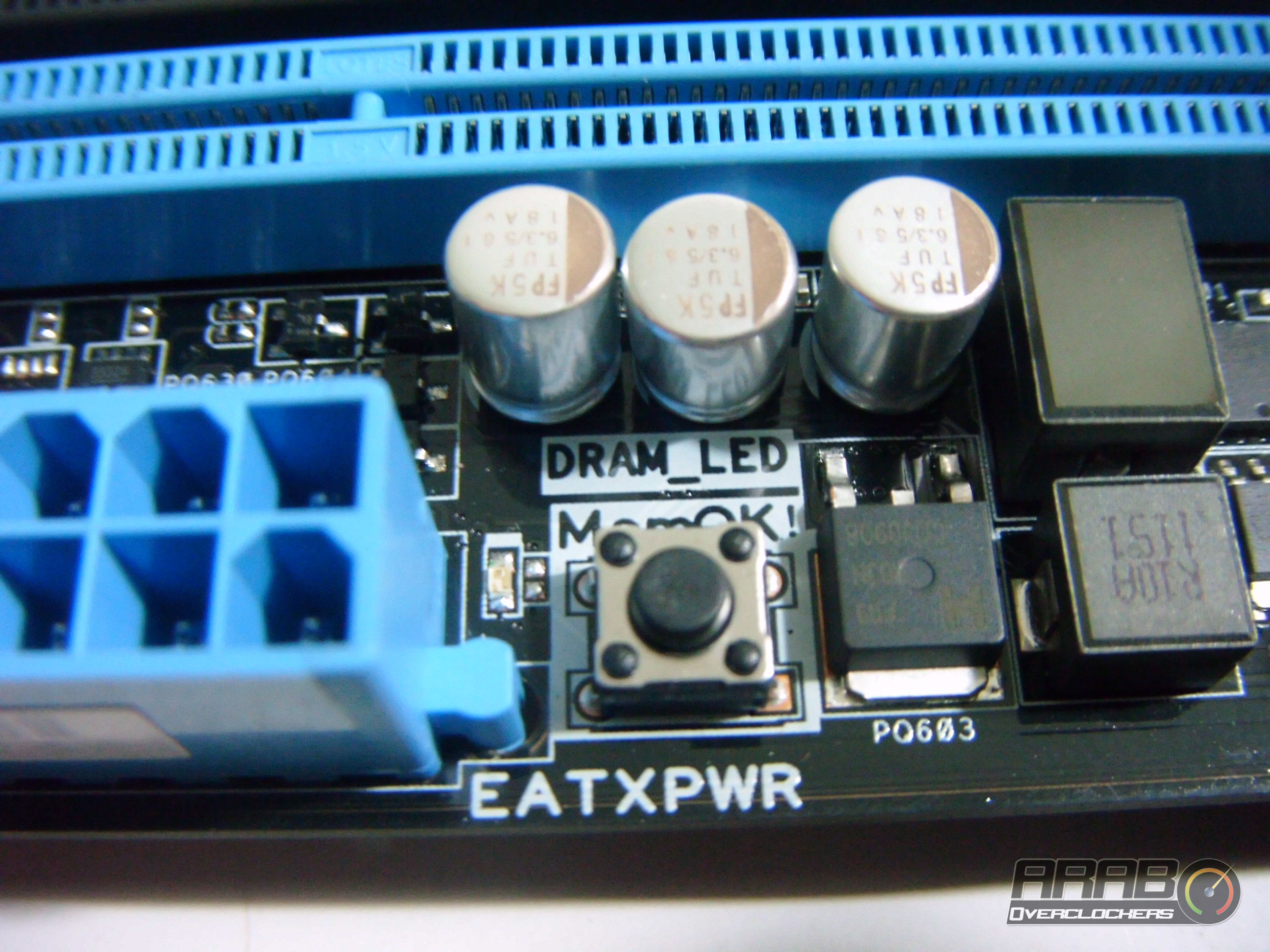 واسفل شقوق الذاكرة يوجد زر صغير كما هو ظاهر في الصورة ، حين الضغط عليه اثناء اقلاع اللوحة فأنه يقوم بفحص الذاكرة MemOK ، اما اذا تم استخدامه اثناء عمل النظام فأنه يقوم برفع تردد تشغيل الذواكر اليا لاعلى تردد يحقق الثبات اثناء العمل . وبجانب الزر توجد مجموعة من الاضواء LED تبين حالة الذاكرة اثناء التشغيل .