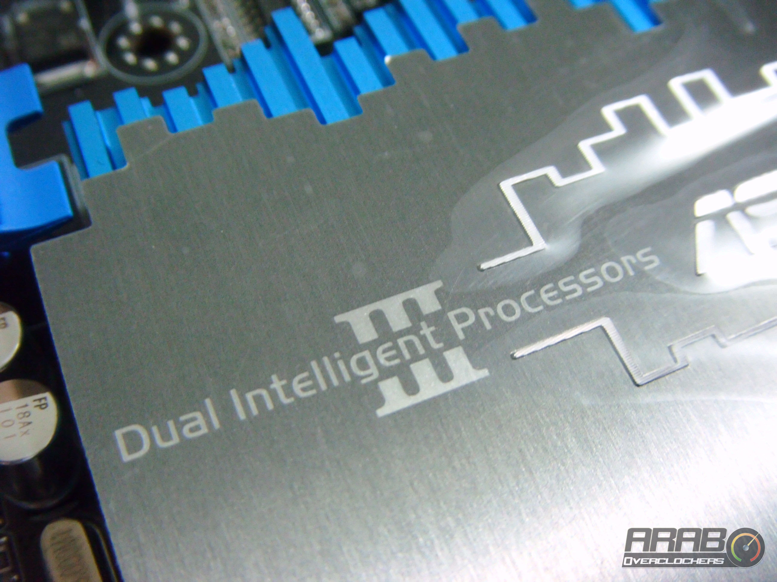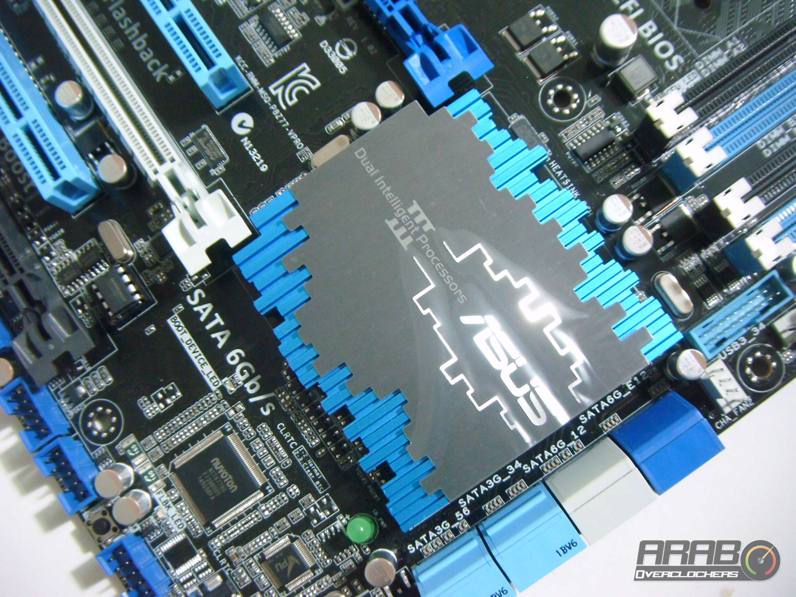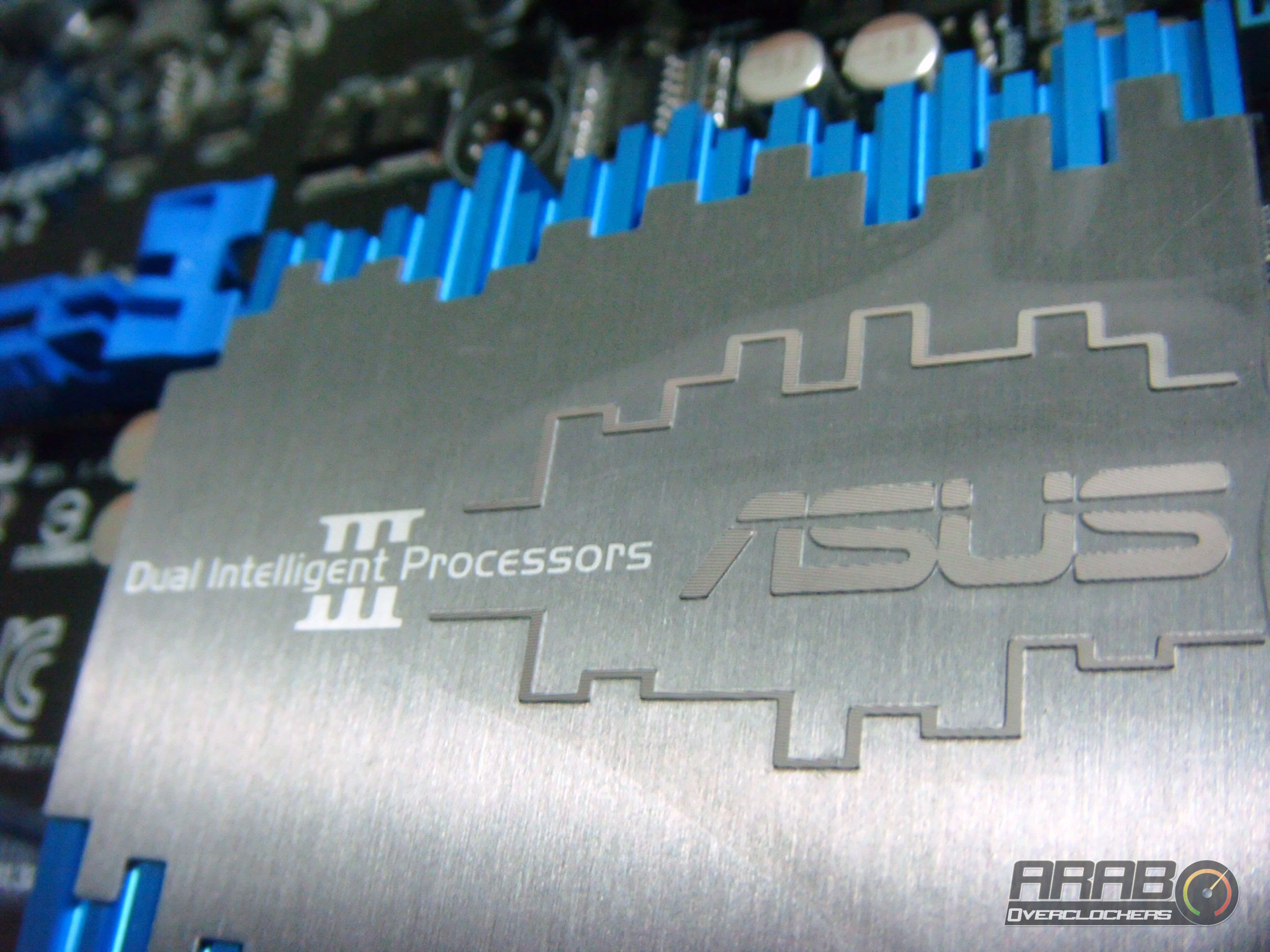 المشتت مطبوع عليه شعار ASUS باللون الفضي وبجواره تقنية Dual Intelligent Processors III التي تضيف المزيد من الاستقرار على عمل اللوحة والمعالج تحت ظروف التشغيل المختلفة .