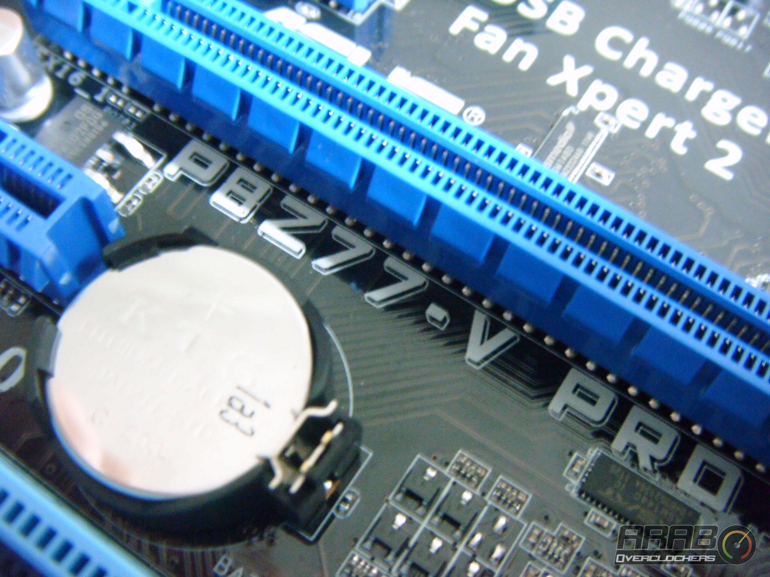 بين شقوق PCE-E نجد اسم اللوحة كاملا P8Z77-V PRO واسفل منه البطارية التي تمد ال BIOS بالطاقة للحفاظ على الاعدادات .