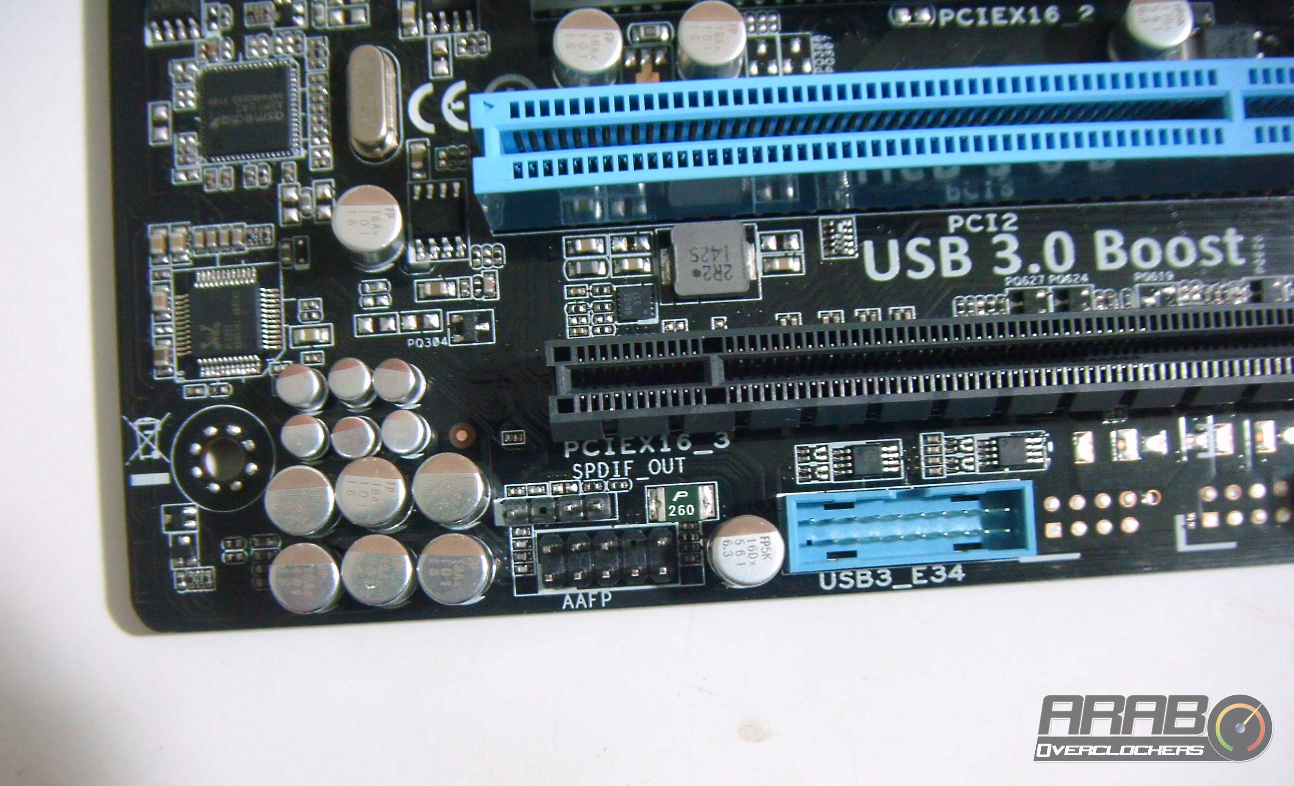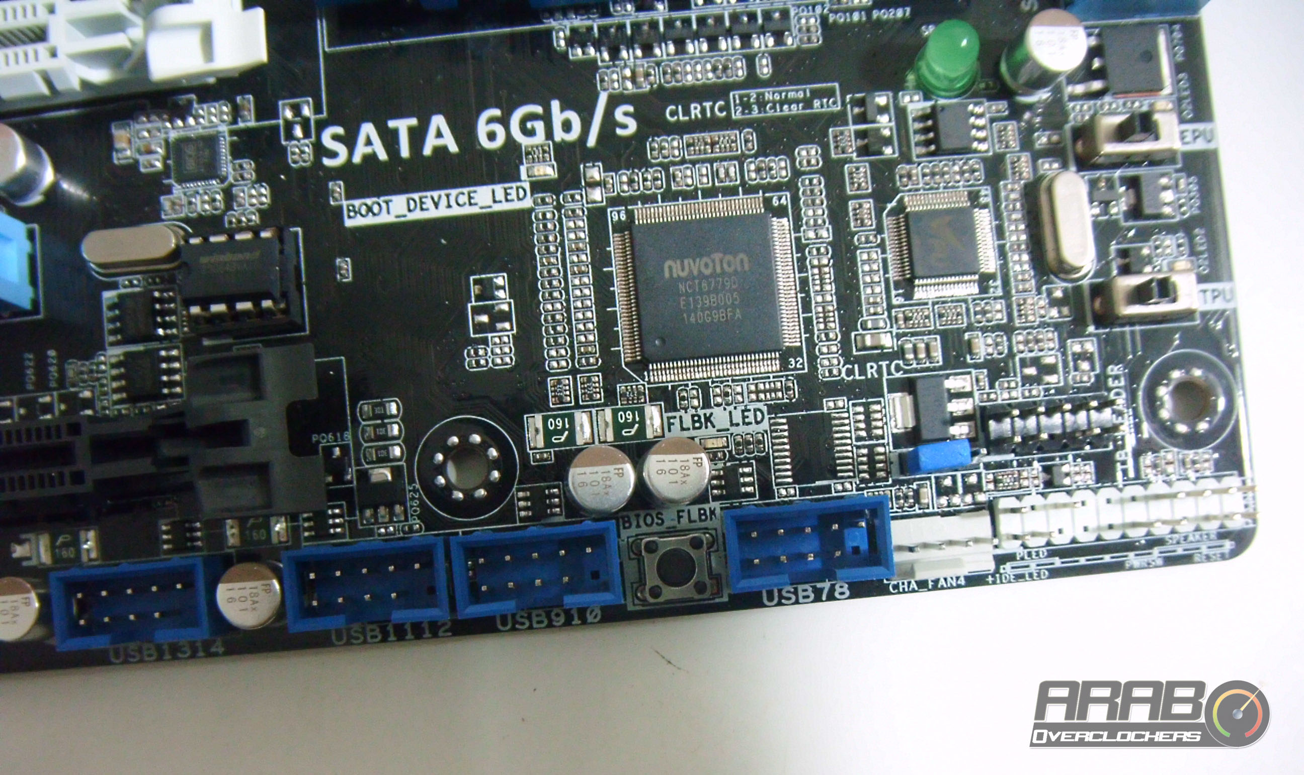 اسفل اللوحة نجد مجموعة كاملة من اسنان (ابر) التوصيل ، فهناك مقبس لتوصيل مقابس الصوت الامامية للصندوق مع مقبس SPDIF للصوت الرقمي ، واربعة مقابس USB 2.0 (ثمان منافذ) ومقبس توصيل USB 3.0 (منفذان) بالاضافة الى زر BIOS FLBK الذي يتيح للمستخدم تحديث ال BIOS او اصلاحه اذا حدث خلل ما ، ومنفذ لتوصيل مروحة مع خاصية PWM (هناك اربعة مقابس على اللوحة ككل) ، ودائرة Clear CMOS لاعادة الضبط الافتراضي للوحة .