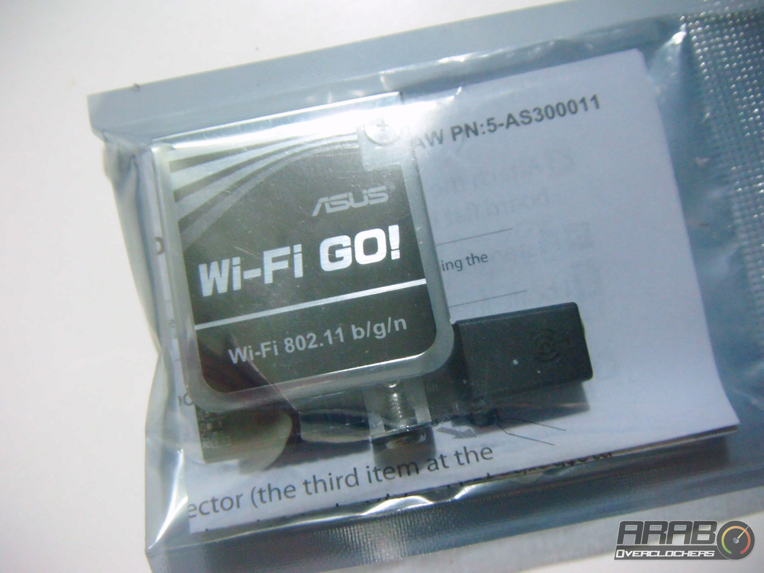 وحدة التوصيل اللاسلكي تظهر في الصورة في غلاف محكم الغلق ، تمتاز الوحدة بانها قابلة للفك والتركيب ، ويتم تركيبها على منفذ PCI-E x1 ومن ثم توصيل الاريال الخارجي (يأتي مرفقا مع اللوحة) ، تسمى الوحدة ASUS Wi-Fi GO وتأتي بدعم لجميع معايير الاتصال اللاسلكي B/G/N والتي تدعم تردد 2.4 جيجاهرتز الاحادي .