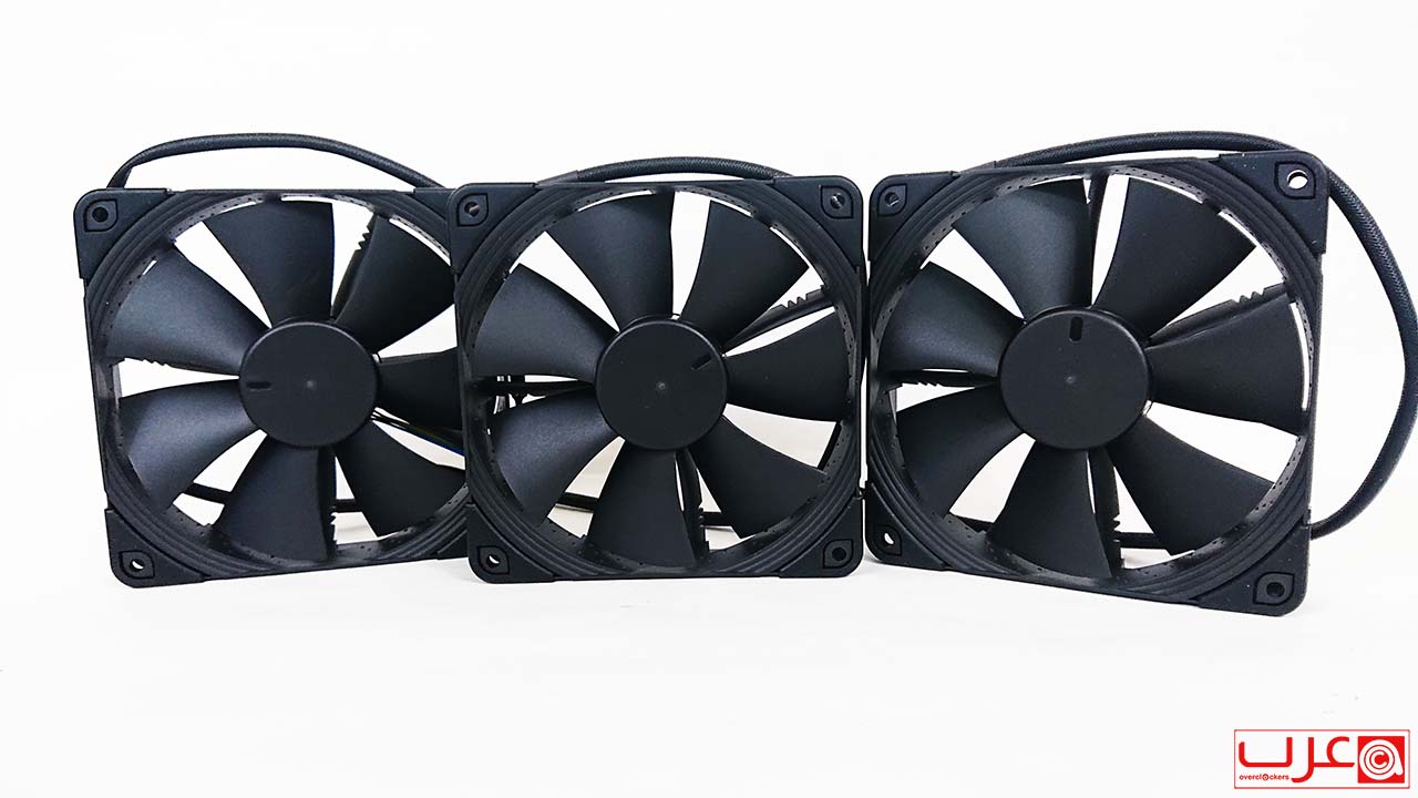 يتم استخدام ثلاثة من مراوح Noctua NF-F12 IndustrialPPC 2000 PWM في ROG Ryujin II 360. هذه المراوح مقاس 120 ملم مزودة بـ 4 طرف PWM وتعمل في نطاق سرعة 450-2000 دورة في الدقيقة. هذه القدرة على السرعة المنخفضة مثيرة للإعجاب بشكل خاص، لا سيما عندما تقترن بخيارات التحكم القوية من اسوس.