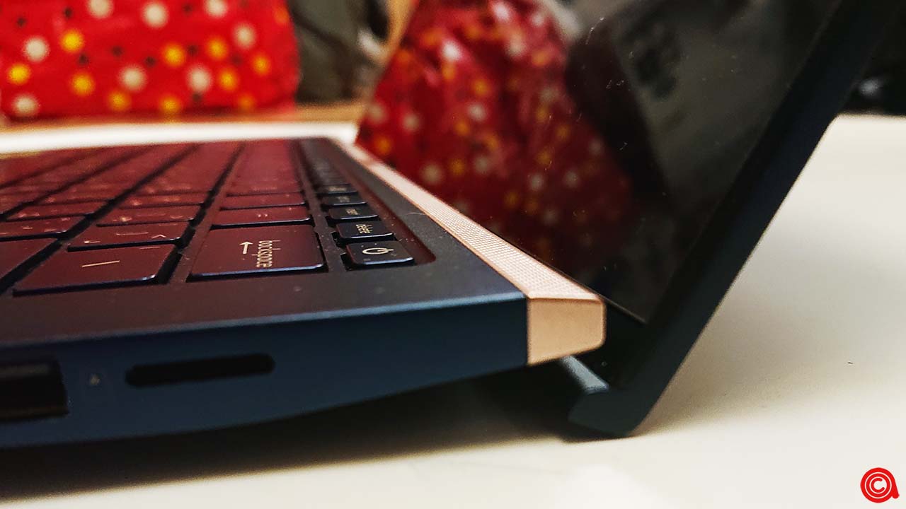 فيما يتعلق بالمواد المستخدمة، يتم استخدام المعدن في الهيكل الرئيسي والغطاء والجزء الخارجي، مع قطعة واحدة من البلاستيك تلتف حول الحافة الخلفية وتدمج فتحات التبريد ، بالإضافة إلى علامة ZenBook التجارية في الداخل، فوق لوحة المفاتيح. لم يترك التصميم مجالًا للعلامة التجارية أسفل الشاشة ، كما هو الحال في معظم أجهزة الحاسب المحمولة، وبالتالي نقلت Asus الشعار هنا. وعند رؤية تصميم هذه الفتحات، كنت آمل أن يكونوا قد وضعوا مكبرات الصوت اسفلها، لكن هذا ليس هو الحال، فالفتحات مجرد ديكور وما زالت مكبرات الصوت تطلق في الجزء السفلي من الحاسب المحمول.