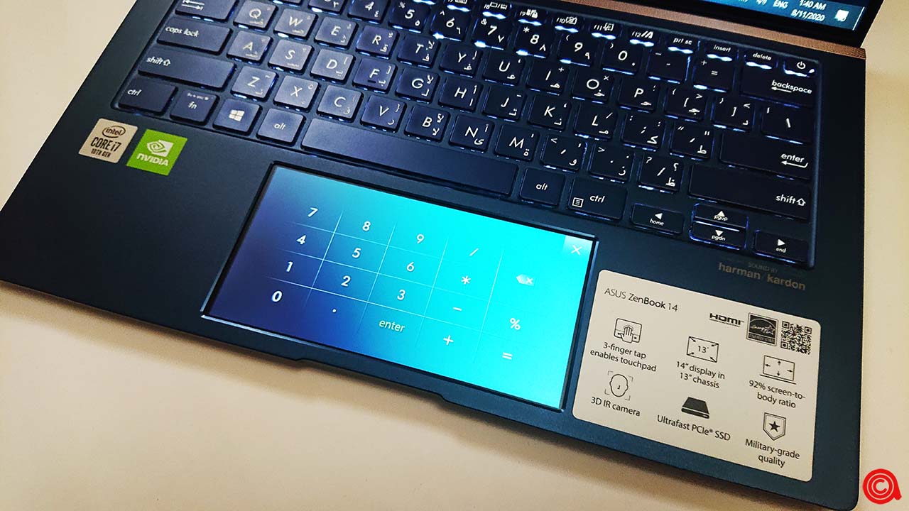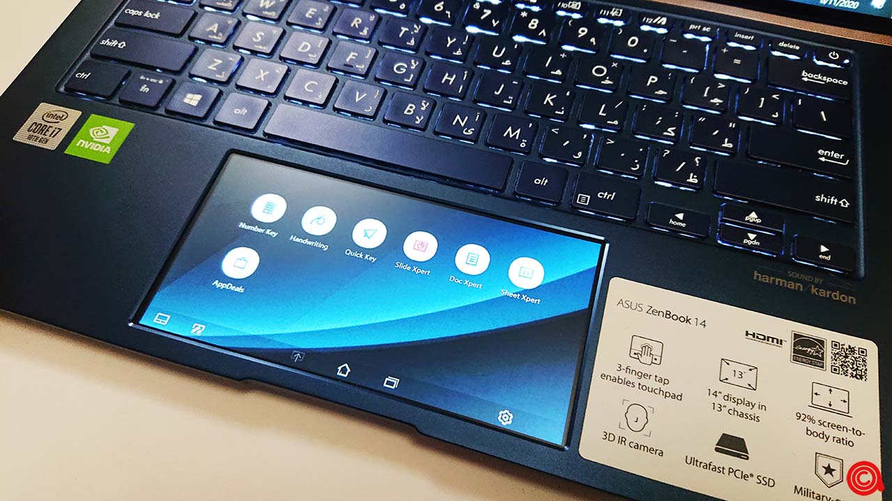 التحديث الكبير هنا هي إضافة ScreenPad، والتي تتكون من لوحة لمس كبيرة 5.65 بوصة مع شاشة فعلية بدقة 2160×1440 بكسل من نوع IPS مخفية تحتها، والتي يمكن للمستخدمين اختيار تمكينها أو تعطيلها بضغطة زر، مفتاح F6. عند إيقاف التشغيل، يبدو السطح ويشبه تمامًا لوحة النقر المغطاة بالزجاج، والتي تعمل بشكل رائع مع الضربات الشديدة والنقرات والإيماءات اليومية. السطح قوي ولا يزعج على الاطلاق، ويتمتع الجزء السفلي بسلاسة وهدوء، مما يجعل هذه واحدة من أفضل لوحات النقر التي رأيتها على حاسب محمول حتى الآن.